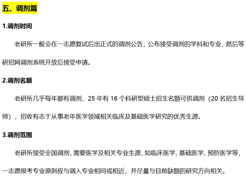 老研所接受全国调剂,需要医学及相关专业生源,如临床医学、基础医学、预防医学等,一志愿报考专业原则应与调入专业相同或相近,并尽量与目前缺额的研究方向相关。