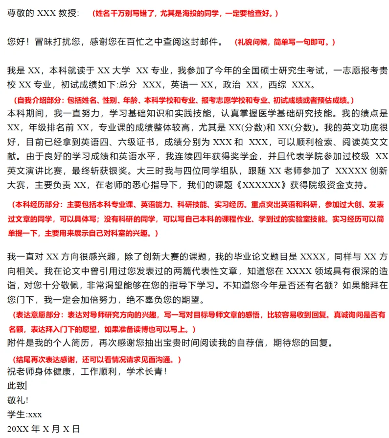 邮件主要是用来联系导师,一般初试成绩出来后就可以给心仪导师发邮件了。联系导师前注意搜集一下导师信息,最好对目标导师的研究方向、发表论文有所了解之后,再写邮件,邮件里要附上你的简历。