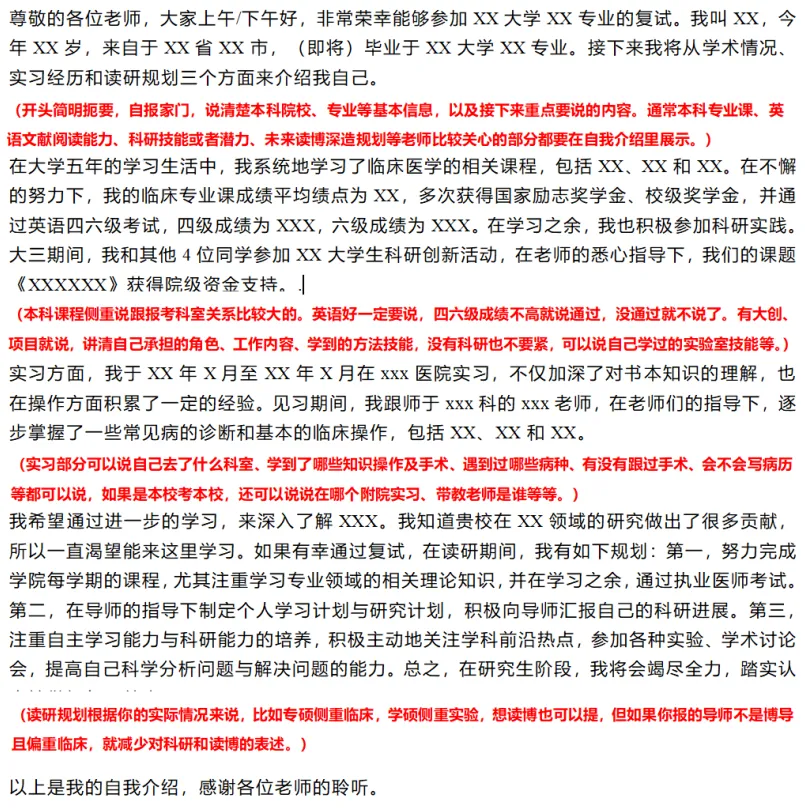 中英文版本都要准备,就算科室只要求中文/英文也准备双份,自我介绍重点准备英文版本,大概3min左右,要非常熟练。中文版本要更加注重信息准确性,注意不要跟简历内容自相矛盾。大家平时练习自我介绍时,可以对着镜子,注意调整自己的表情,不要像背书机器一样,尽量自然大方。