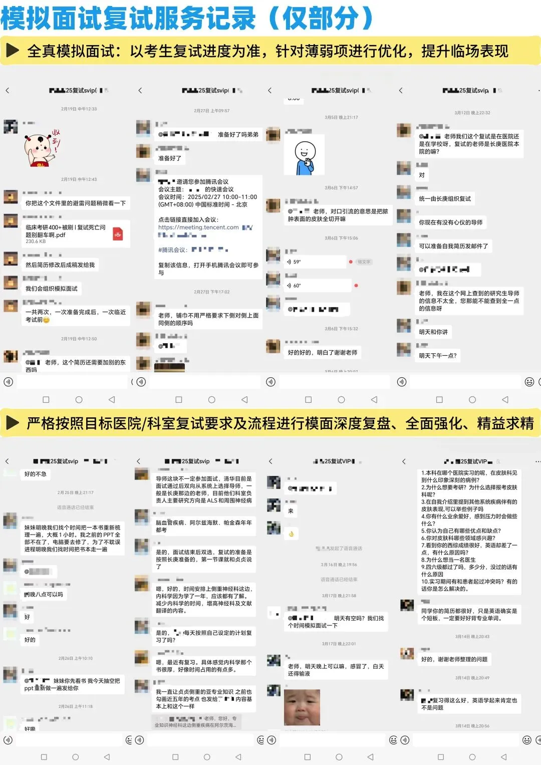 本校各个科室、各个医院,几乎都有我们各个团队的初试、复试录取学员、团队服务成员,没有什么打听不到的,所有关于本校初试、复试的相关问题,通通解决。你们可以看一下我们的通讯录截图,看一下我们资料页截图,然后看一下我们关于复试的,各项带学生的服务记录,你会发现,做本校考研初复试的团队,比我们专业的,几乎没有!!!