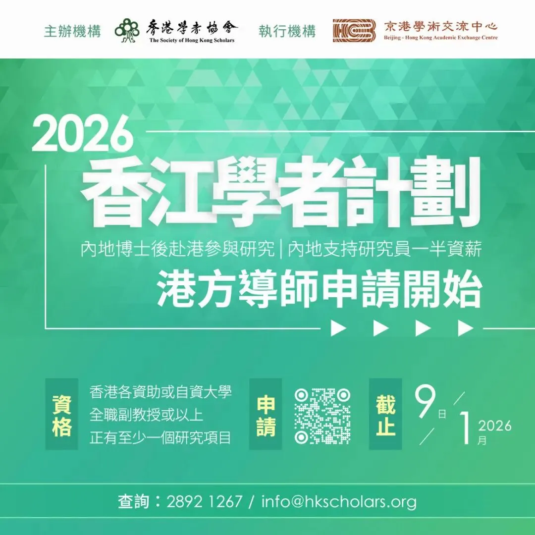 本年度继续面向香港、澳门及台湾地区招收优秀研究生,欢迎有志于内地深造的同学踊跃报名参加。同时,「香江学者计画」亦同步开放港方导师申请,鼓励符合资格的学者踊跃报名参与,携手推动两地学术交流与人才培养,共创未来!