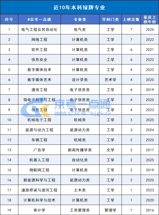在近十年发布的《中国本科生就业报告》显示,共计19个专业进入过本科绿牌专业名单。该报告从市场就业率、应届毕业生平均薪资角度上,总结出绿牌专业,可以为学生和家长提供一个专业选择的参考。