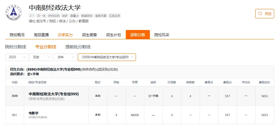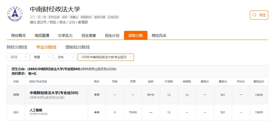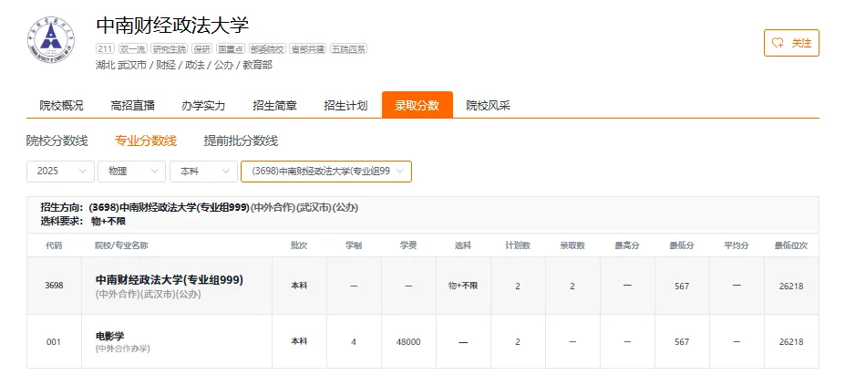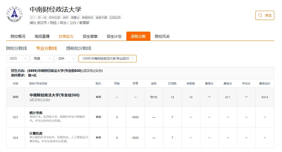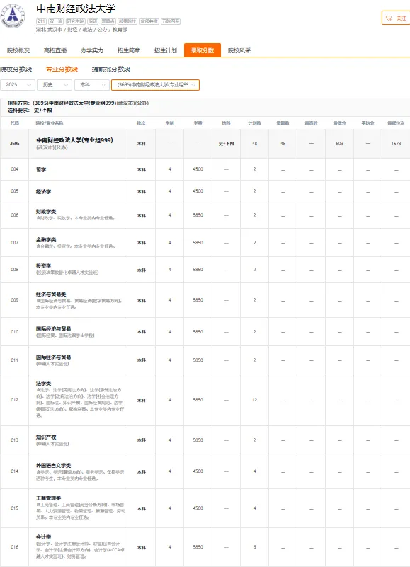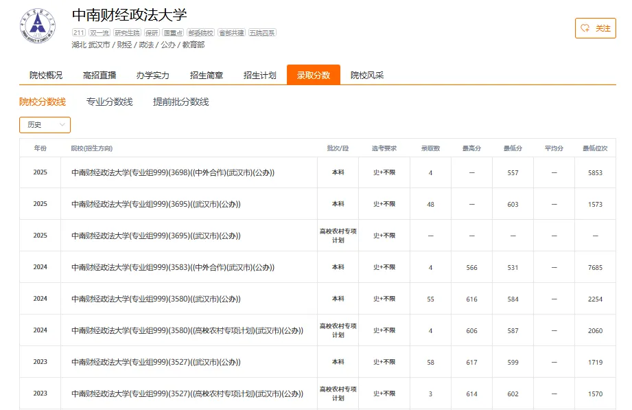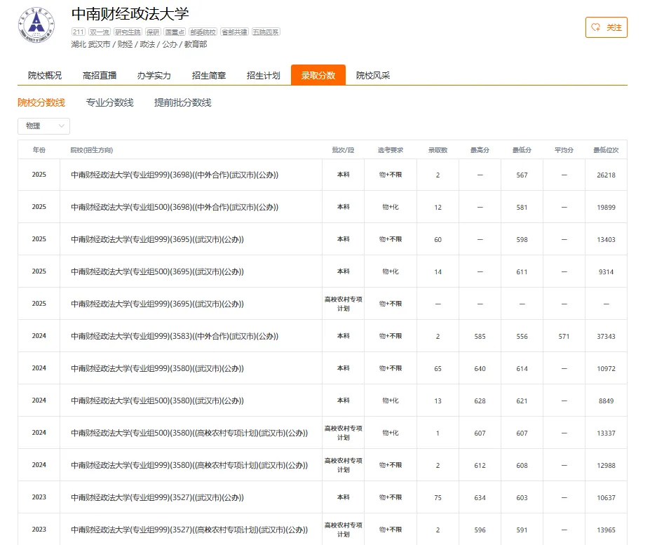 中南财经政法大学2025年在福建省物理类和历史类各专业组最低录取分数线是多少?位次排名是多少?福考直通车李老师整理该院校的各专业的具体分数如下,供2026届考生及家长数据参考,同时要用近三年数据进行对比;