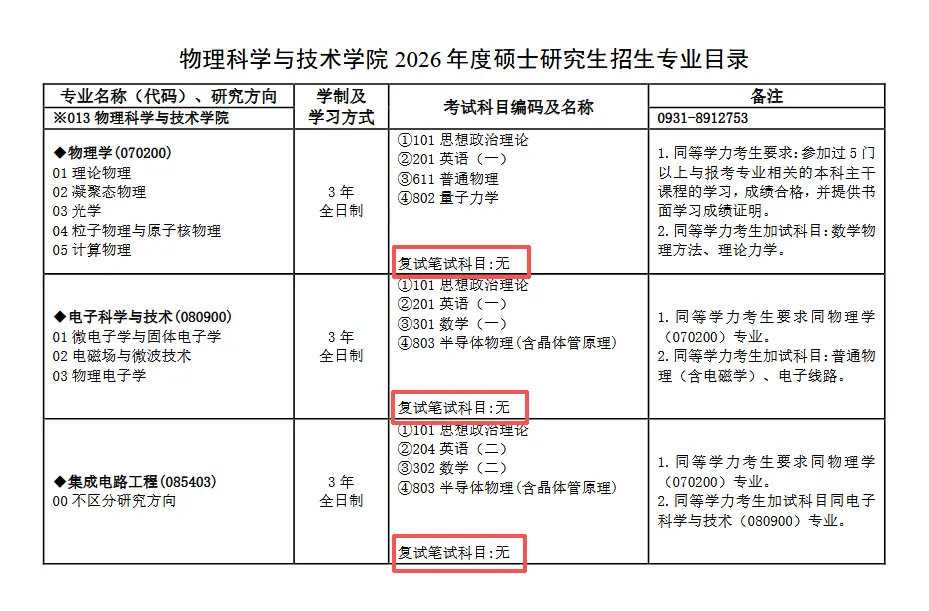兰州大学2026招生专业目录显示多个学院取消复试笔试,以物理科学与技术学院为例,2025年仍要求考核“理论物理基础”等笔试科目,2026年则全部删除,所有专业复试笔试科目均标注为“无”。