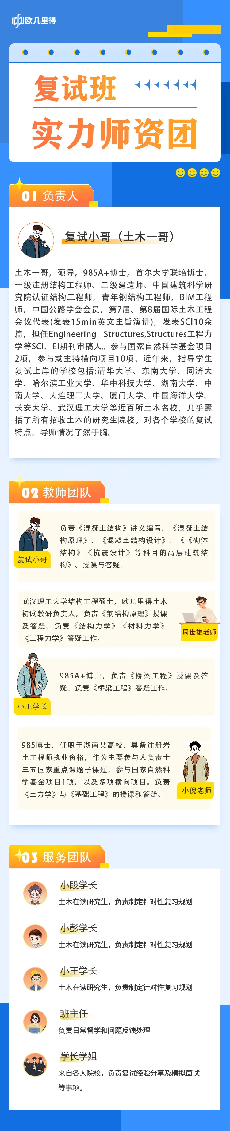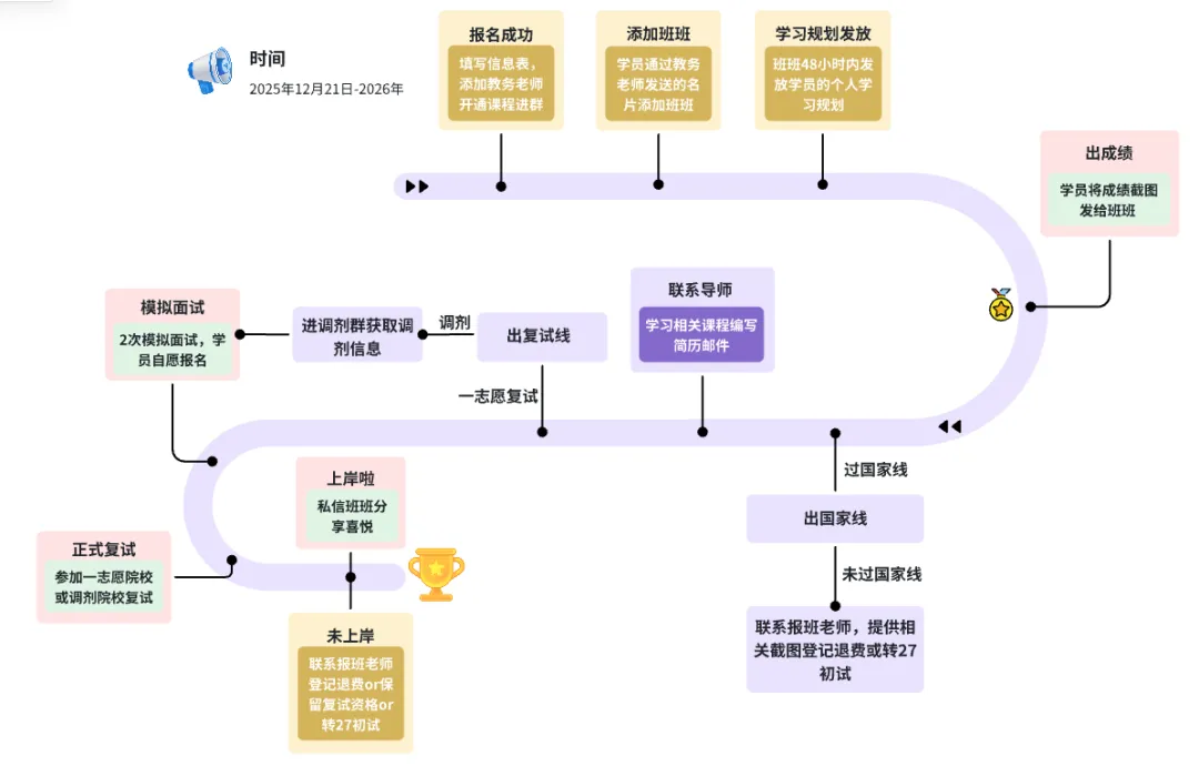 每位加入我们复试班的学员,都将享受到由我们精心打造的强大服务团队全方位支持。我们的团队不仅专业精湛,更以贴心入微的服务,确保每位学员在复试备考过程中无忧前行,不落单兵,稳稳助力大家迈向成功彼岸,成功上岸!!