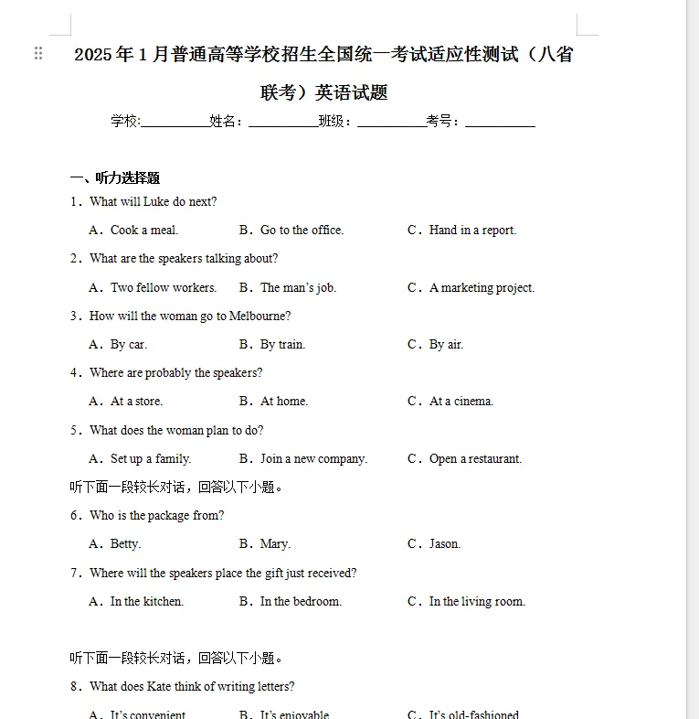 >2025年1月普通高等学校招生全国统一考试适应性测试(八省联考)英语试题