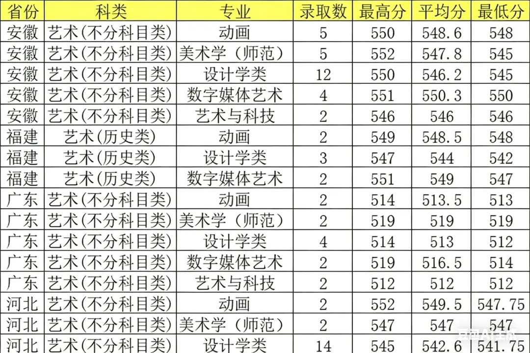 2025年招收430名美术生,不组织校考,考生高考外语单科成绩达到60分(满分按150分计),对其他成绩无特别要求,按照各省规定的平行志愿综合分录取。