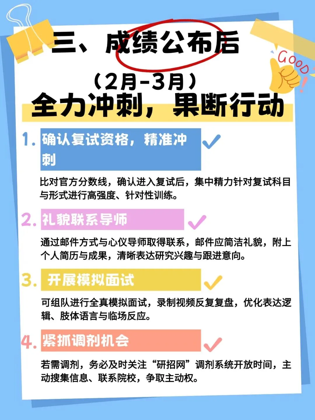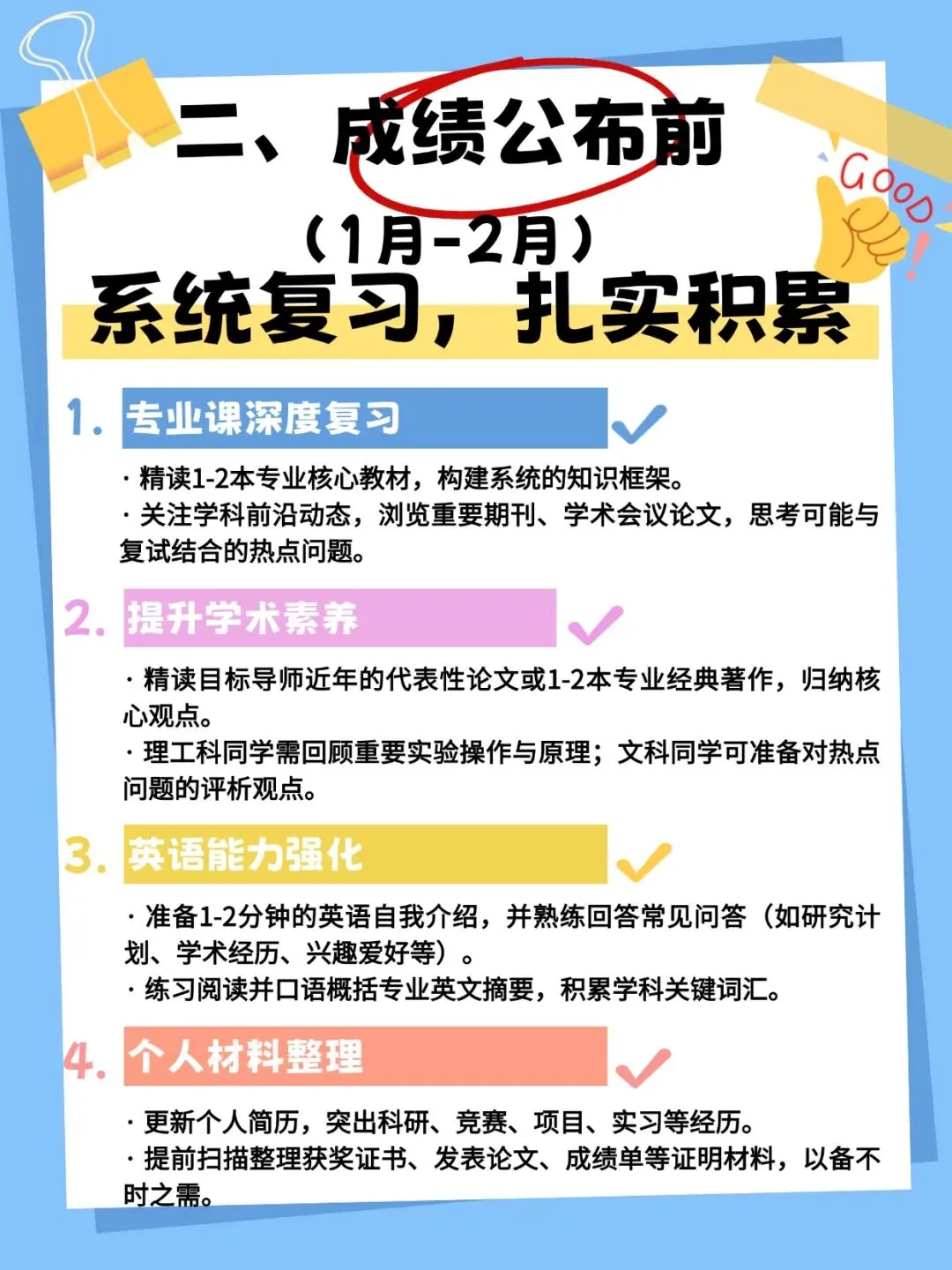 考研初试结束,是短暂休整的转折点,更是迎接下一场挑战的开始。在等待成绩与复试的这段时间里,主动规划、充分准备,将成为你成功上岸的关键。以下是一份详尽的阶段性准备指南,请收好!