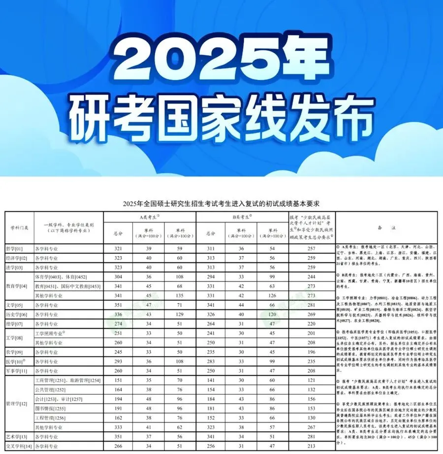 国家线即全国硕士研究生考生进入复试基本分数要求,是基础分数线。分为总分线和单科线,必须同时达标才算“过线”。国家线是所有考生的第一道关卡,过了国家线,才有资格进入后续的复试或调剂。教育部根据全国不同地区经济发展情况和教育水平等,把全国31个省市自治区分为两类,分别为A区和B区。这两类地区的分数线通常会相差2~10分。A区:大都是教育强省,教育资源较多,各大名校也多集中于A区,因而报考人数多竞争比较激烈。B区:大都为教育稍弱的省份,B区考生的竞争相对于小一些。国家线依据不同地区,分数线标准有所差异,即A区线和B区线。教育部按照A区、B区制定并公布参加全国统考和联考考生进入复试的初试成绩基本要求。报考地处A区、B区招生单位的考生,分别为A类考生和B类考生。A类考生即报考地处一区招生单位的考生。一区为北京、天津、河北、山西、辽宁、吉林、黑龙江、上海、江苏、浙江、安徽、福建、江西、山东、河南、湖北、湖南、广东、重庆、四川、陕西等21省(市)。