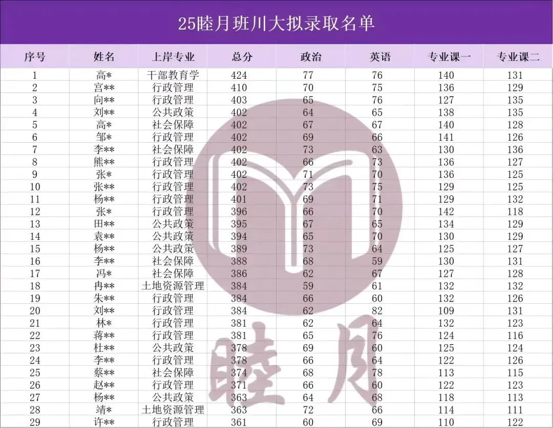 从2018-2025,睦月七年深耕公管考研,累计上岸学员500+,其中状元考生30+,包括但不限于2019级川大蒋同学(410分)、20级川大湛同学(415分)、21级川大朱同学(438分)、21级成电张同学(407分)、22级川大王同学(413分)、22级成电张同学(429分)、23级成电黄同学(400分且复试后第1名)、23级西南交大周同学(411分睦月复试班)、23级川大史同学(421分)、24级成电钟同学(424分)、24级川大土管何同学(439分)、行管张同学(430分)、社保宁同学(419分)、教经毛同学(427分)、应急魏同学(404分)、干教李同学(416分)以及25级成电达同学(402分)、西南交大刘同学(373分复试班逆袭为第1名)、川大高同学(424分)、行管宫同学(410分)、政策刘同学、社保李同学、社保高同学(均402分)。