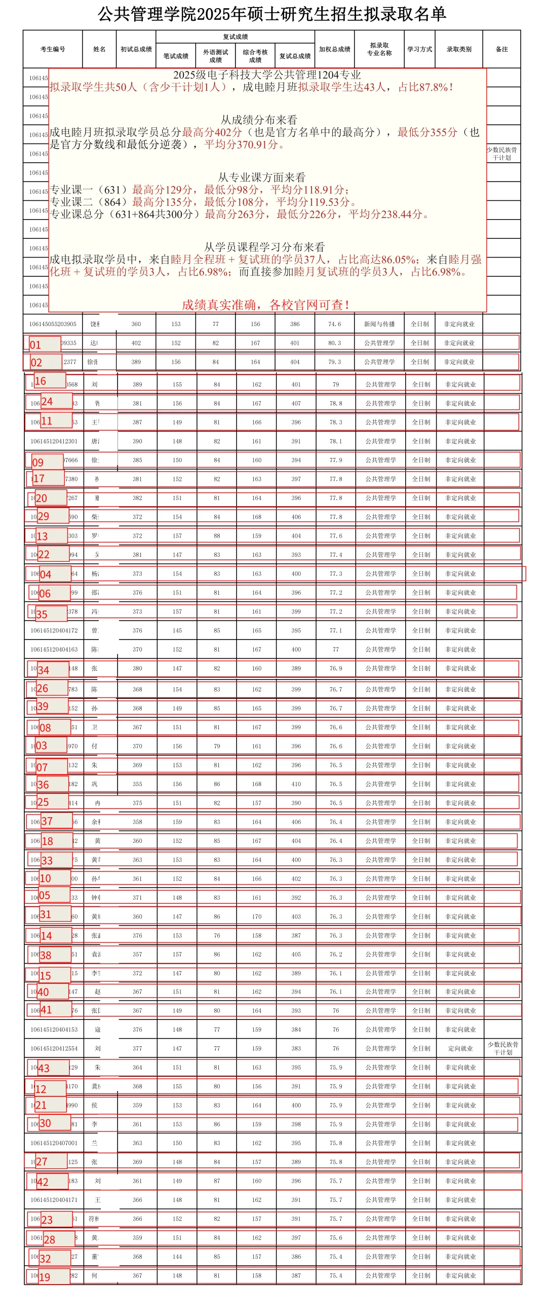 以上所有成绩真实准确,各校官网可查!以电子科技大学公共管理学院学院为例,睦月所有上岸学员均可在其2025年硕士研究生招生拟录取名单中真实查到!
