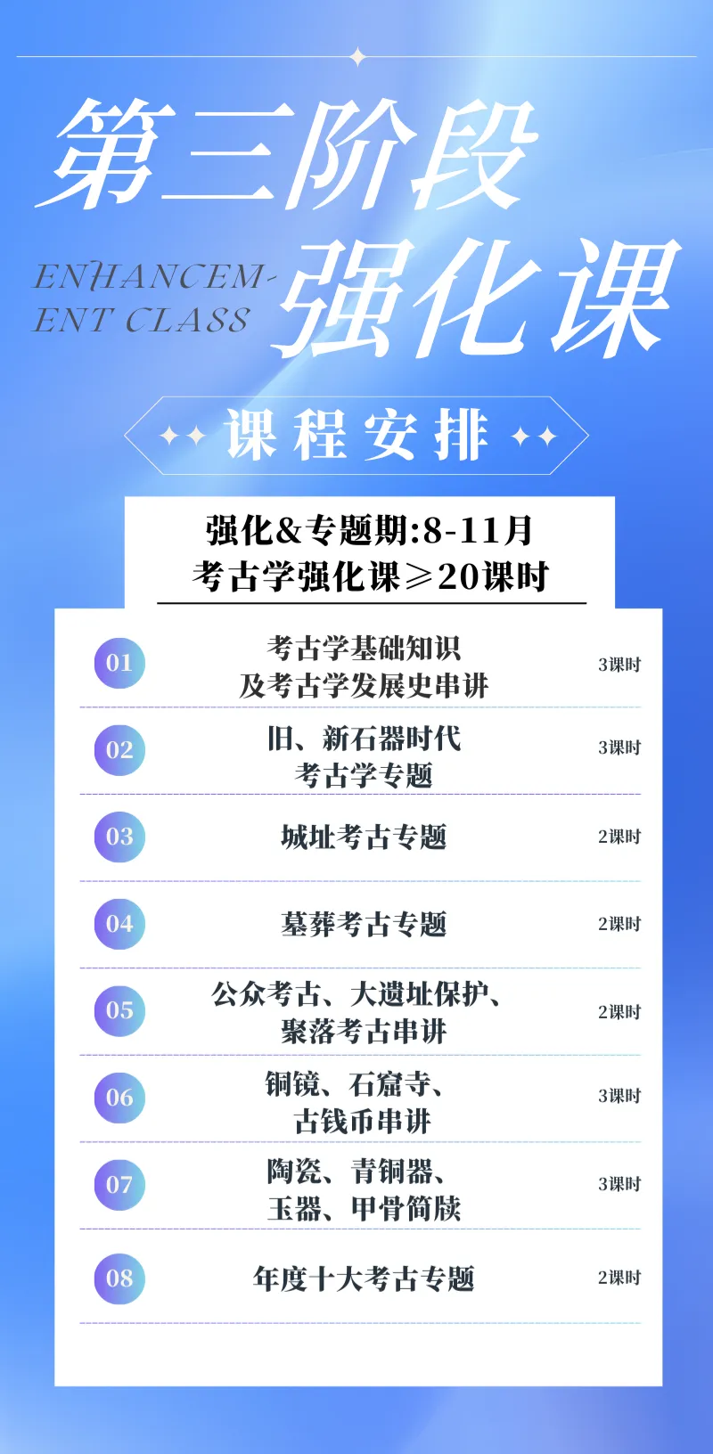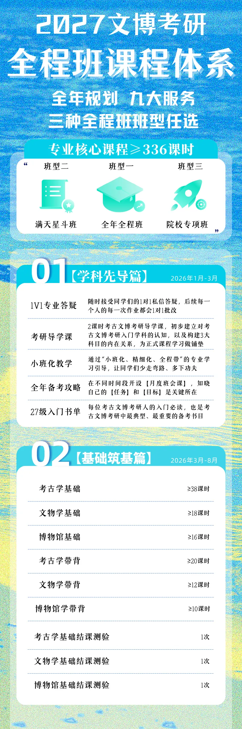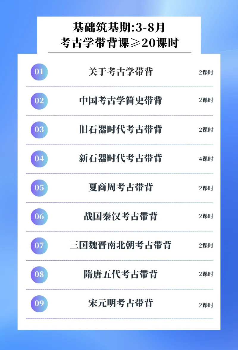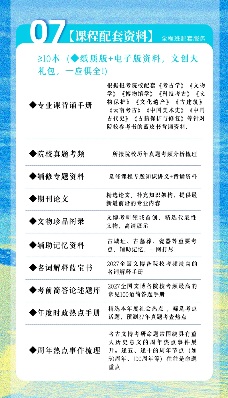 全年全程班学员,享受的服务内容覆盖考古学、文物学、博物馆学、科技考古、文物保护、文化遗产、古建筑、美术史、复试等全年全部课程。