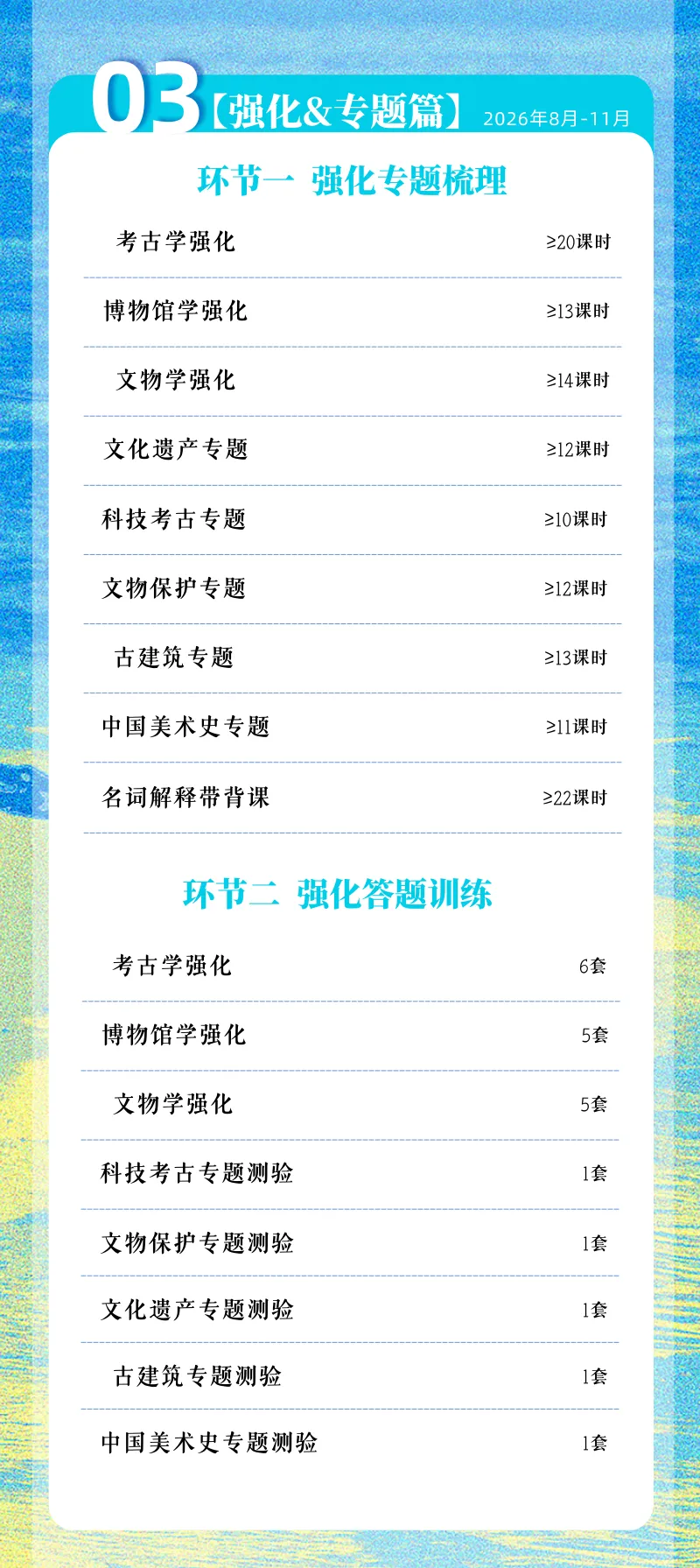 专题强化课程涵盖了考古学专题强化、文物学专题强化、博物馆强化、科技考古专题强化、文物保护专题强化等课程内容!