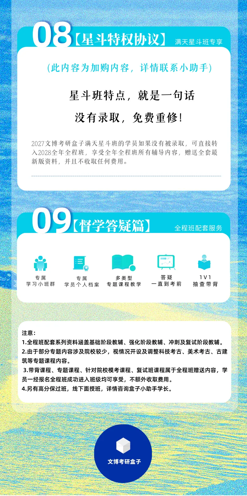 满天星斗班学员,除享受全年全程班的所有服务之外,如果最终没有被录取,可直接转入2028全年全程班,享受全年全程班所有辅导内容,赠送全套最新版资料,并且不收取任何费用。