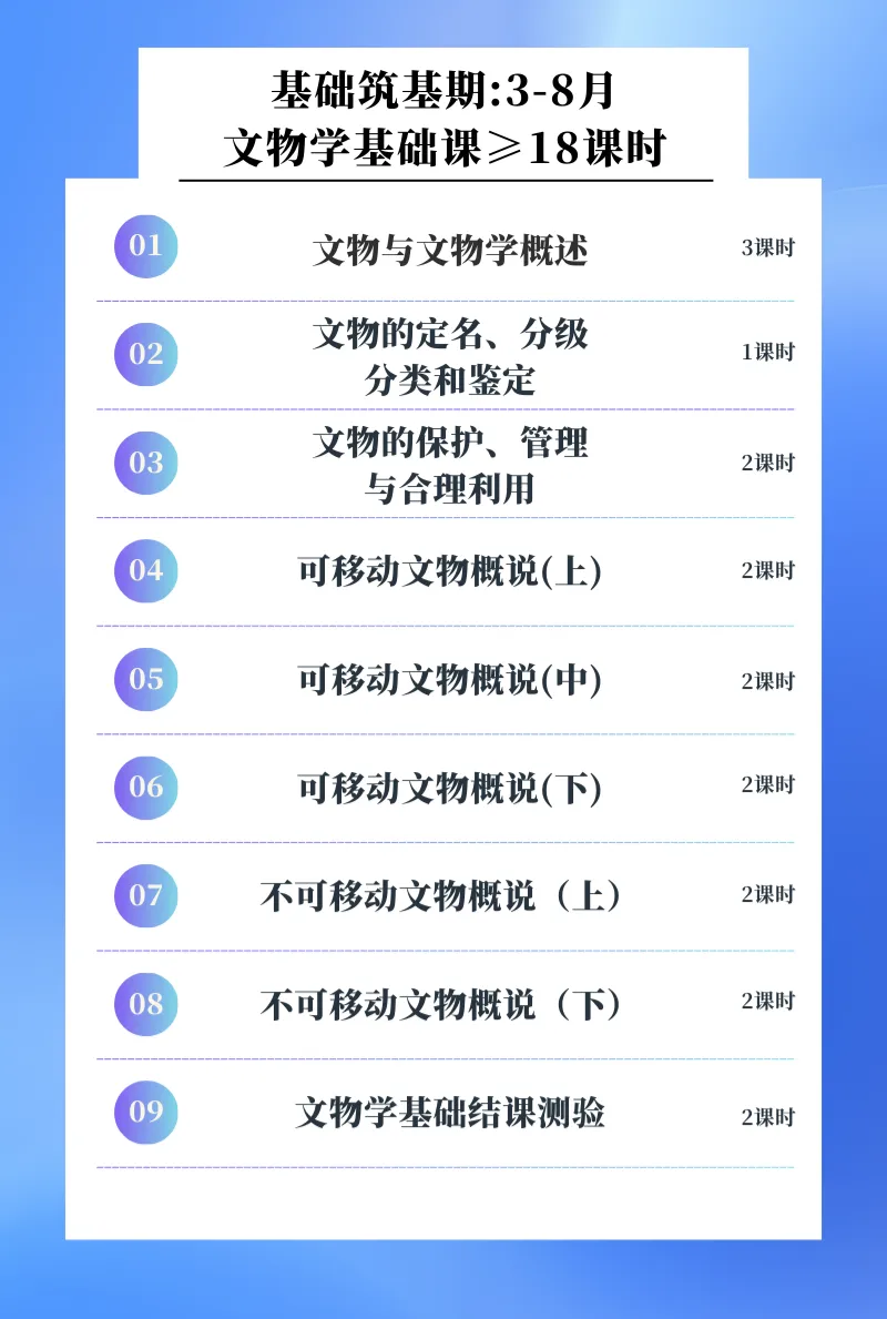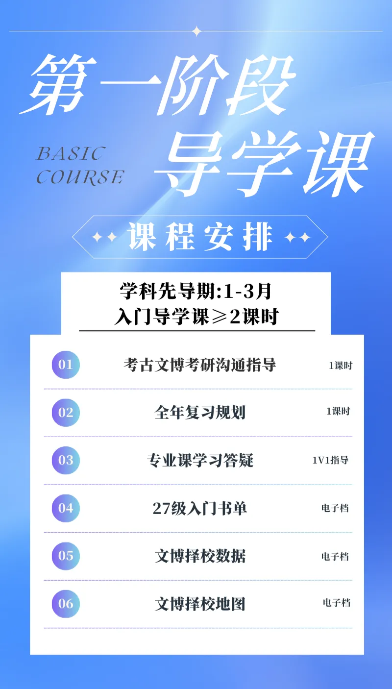 主要是对文博考研的导学答疑。带领大家了解文博考研的考试范畴和学习流程,初步建立对文博考研入门学科的认知,做好全年节奏时间规划,构建3大基础科目的内在关系,为正式课程学习做铺垫,拒绝割裂式学习3大基础科目。并教大家如何针对自身实际来择校、选择专业!