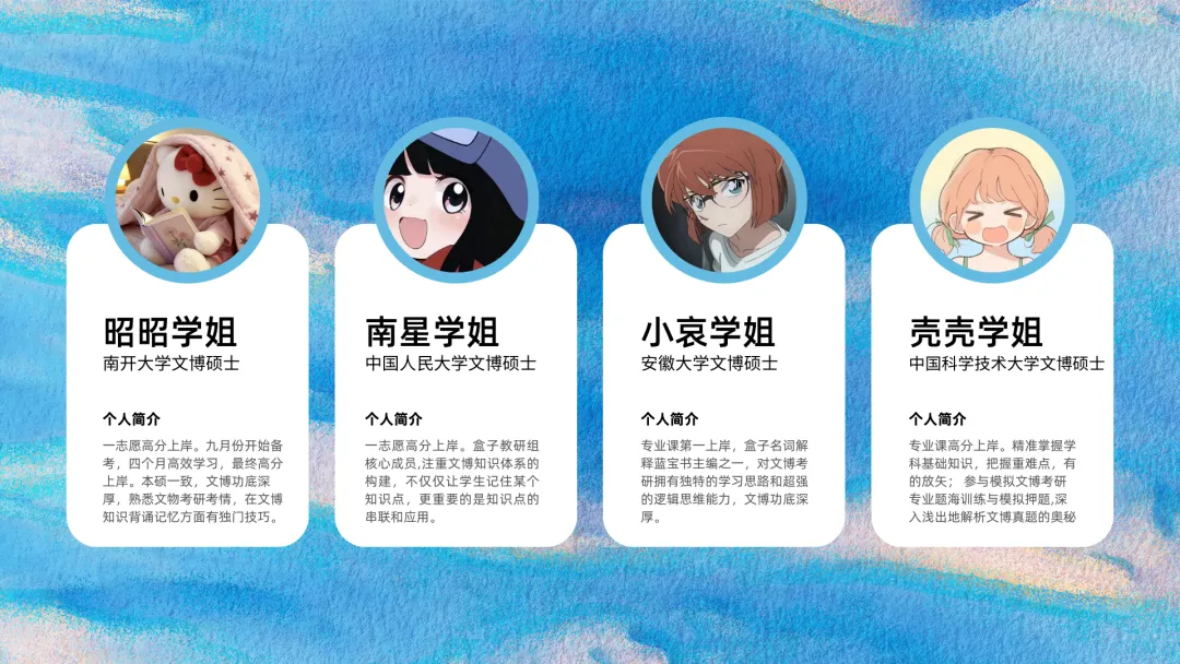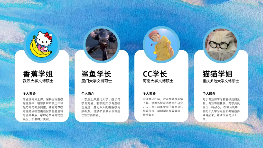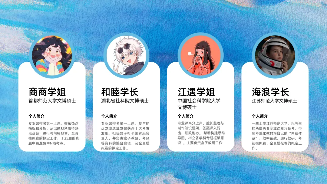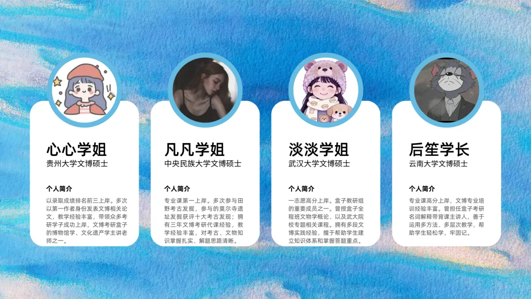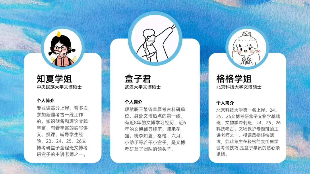 2026盒子全程班课程内容,由盒子学长带头,知夏学姐、格格学姐、心心学姐等主讲,其他教研组成员目前主要负责文博学科的教研和助教工作,主要成员是以盒子小助手学长为首的一众团队。