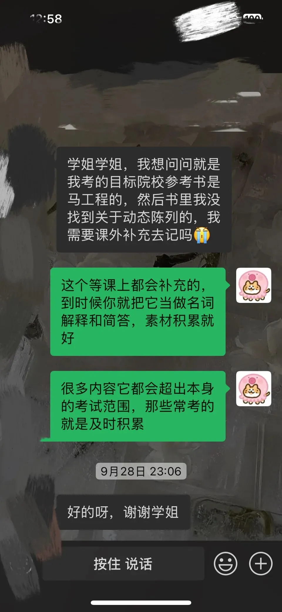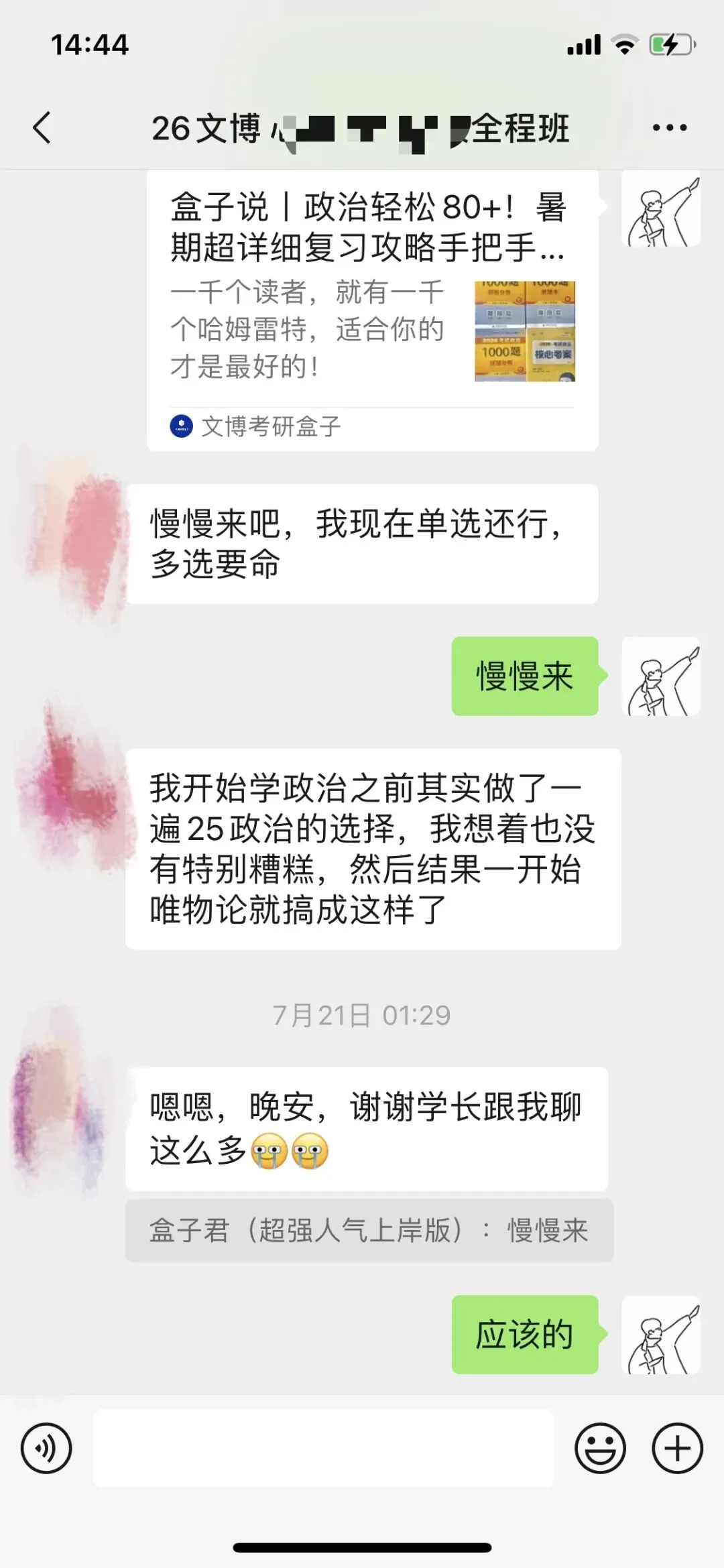 及时关怀陷入emo的同学,稍有状态不佳的同学,就很耐心很用心的去帮助同学调整心态,回归学习的节奏。还是盒子常说的那句话,有疑惑有问题随时给盒子留言,盒子总能帮你解决备考路上的难题!