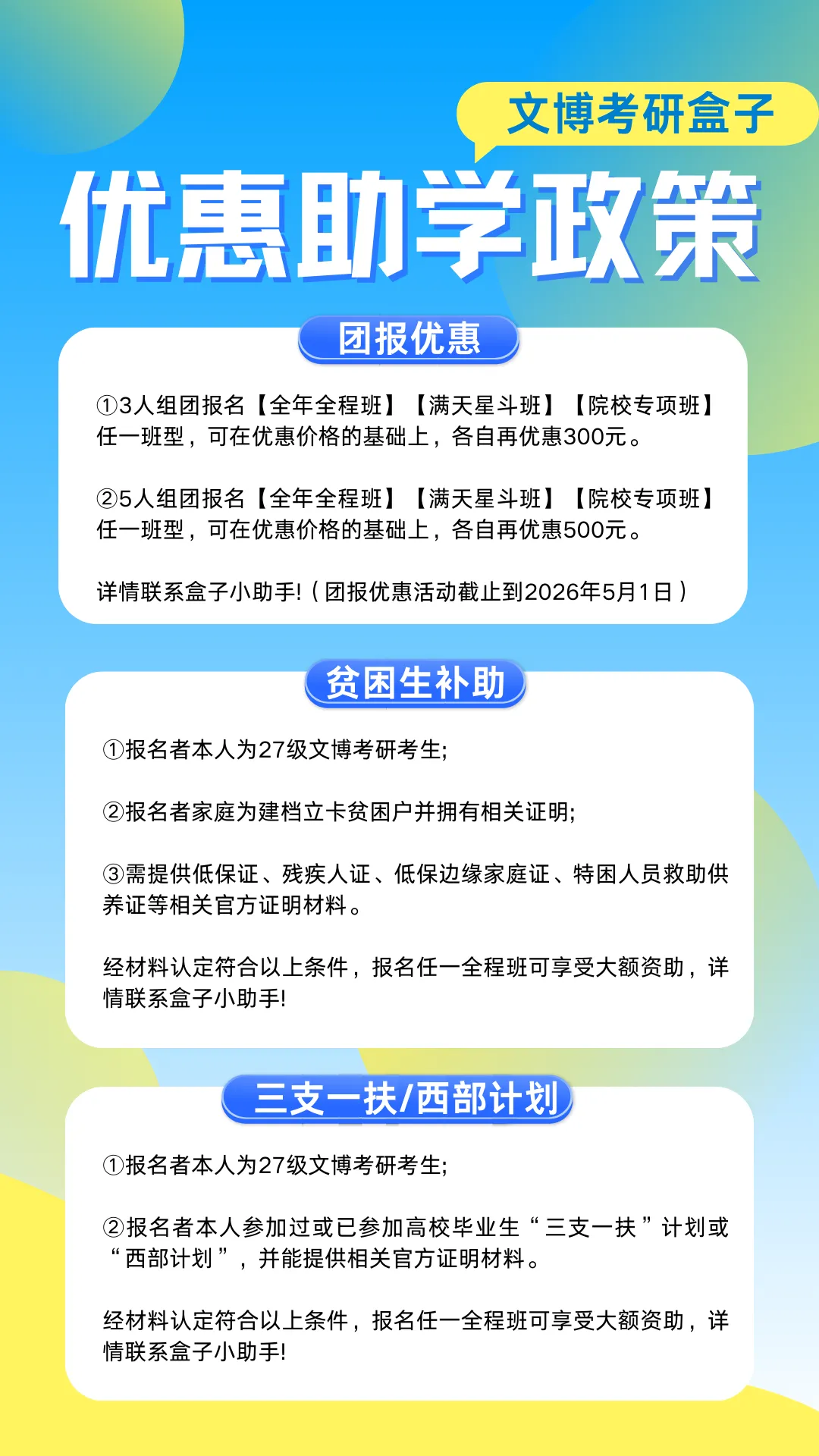 ⭐一是组团报名有额外优惠;⭐二是资助贫困家庭考生;⭐三是资助参与过或正在参与“三支一扶”计划、“西部计划”的考生。