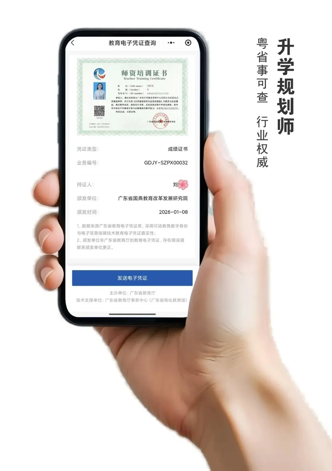 【亮点】:广东省国典教育改革发展研究院与(广州)升学服务管理中心联合发证,证书为“粤省事”可查的广东省教育厅认证的“数字证书”,资深专家资质。