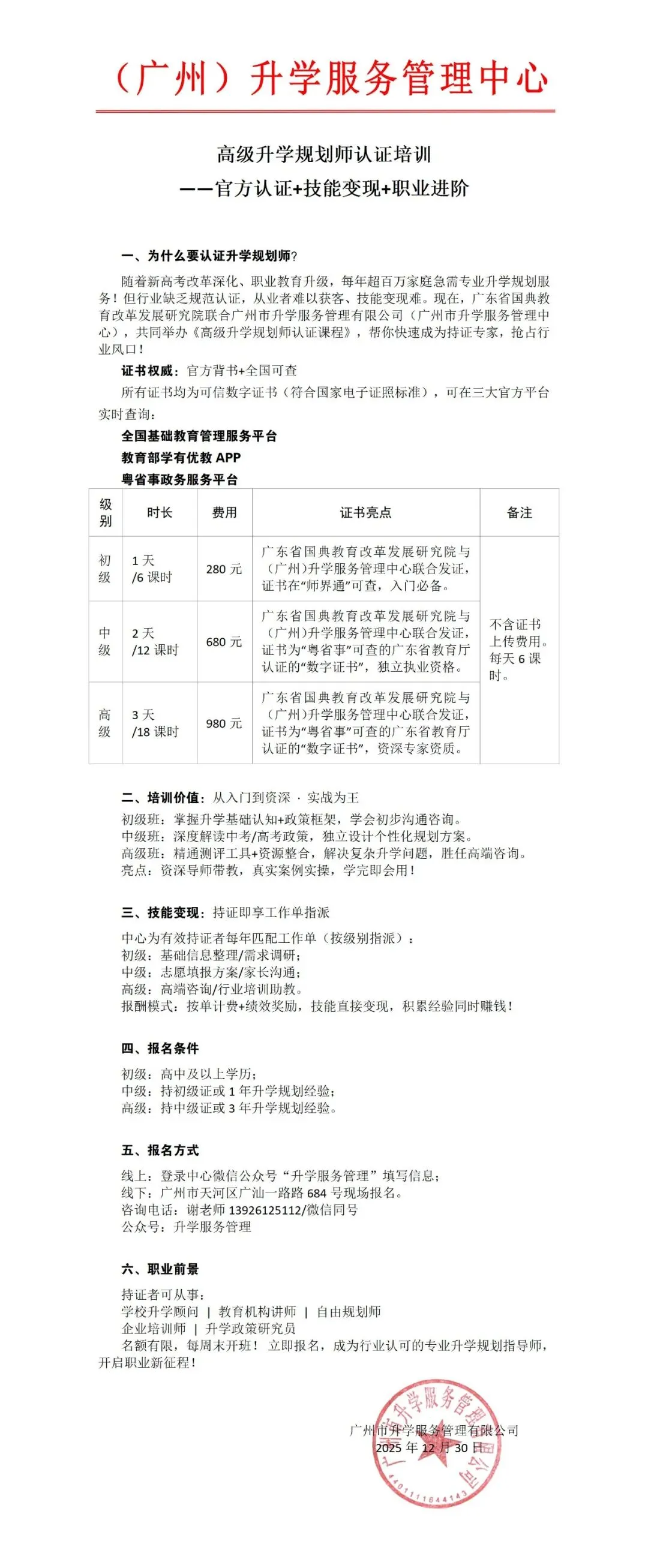 (广州)升学服务管理中心为为有效持证者匹配工作单,并免费享有每年一次的新政策解读课程。