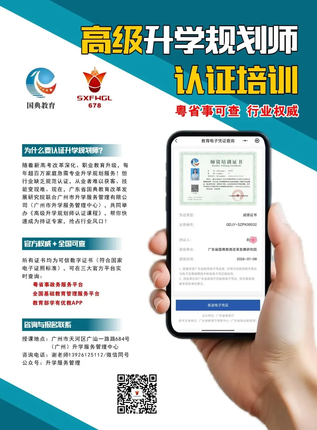 【亮点】:广东省国典教育改革发展研究院与(广州)升学服务管理中心联合发证,证书为“粤省事”可查的广东省教育厅认证的“数字证书”,独立执业资格。