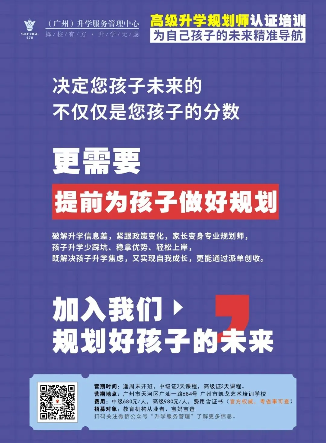 中级班:深度解读中考/高考政策,独立设计个性化规划方案;取得证书后经协商可成为(广州)升学服务管理中心签约二级合作规划师,获得中心指派服务任务