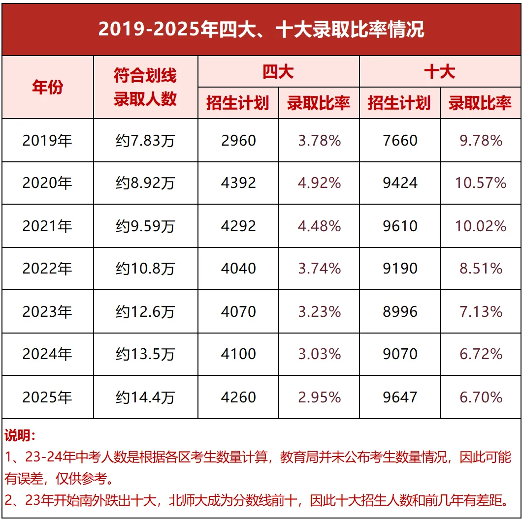 虽然深圳整体公办普高学位有增加,但主要集中在中游及下游梯队的高中。2025年中考人数约14.4万,四大招生人数4000余人,四大率不足3%,相当于每100个深圳中考生里不到3个能上四大,竞争异常激烈。大家在择校的时候,要适当地调低目标。