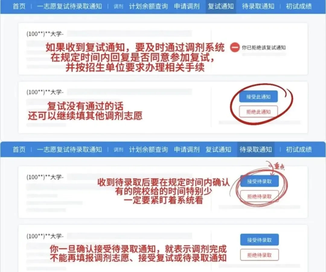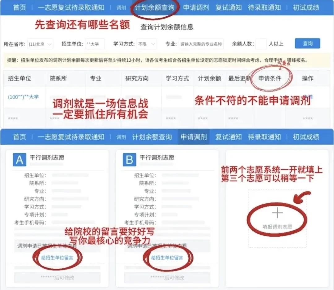1️⃣一定要熬夜调剂!一定要熬夜调剂!一定要熬夜调剂!重要的话说三遍!因为有的院校可能会不接受也不拒绝,那么你的志愿就会被锁36个小时,建议同学们选择学校的时候可以上网搜搜学长学姐们有没有这样的经历,如果有的话可以避雷一些”锁王“学校