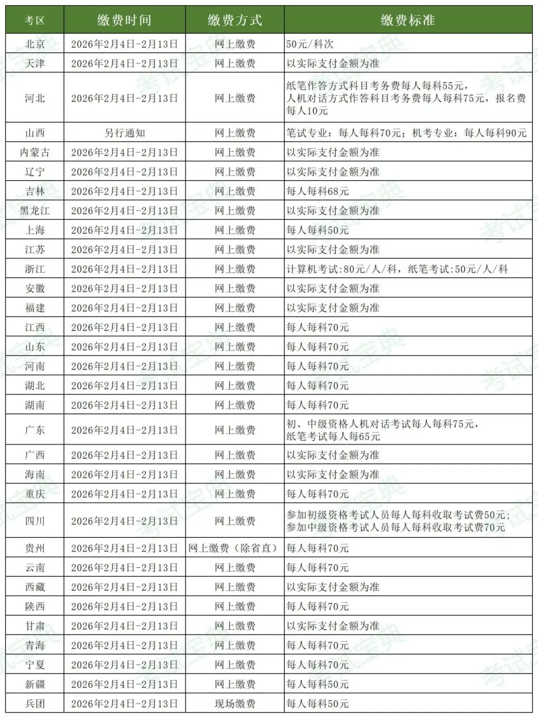 部分考区缴费标准标注 “以实际支付金额为准”,考生缴费时需以报名系统显示的金额为准,如有疑问可咨询当地考点工作人员。