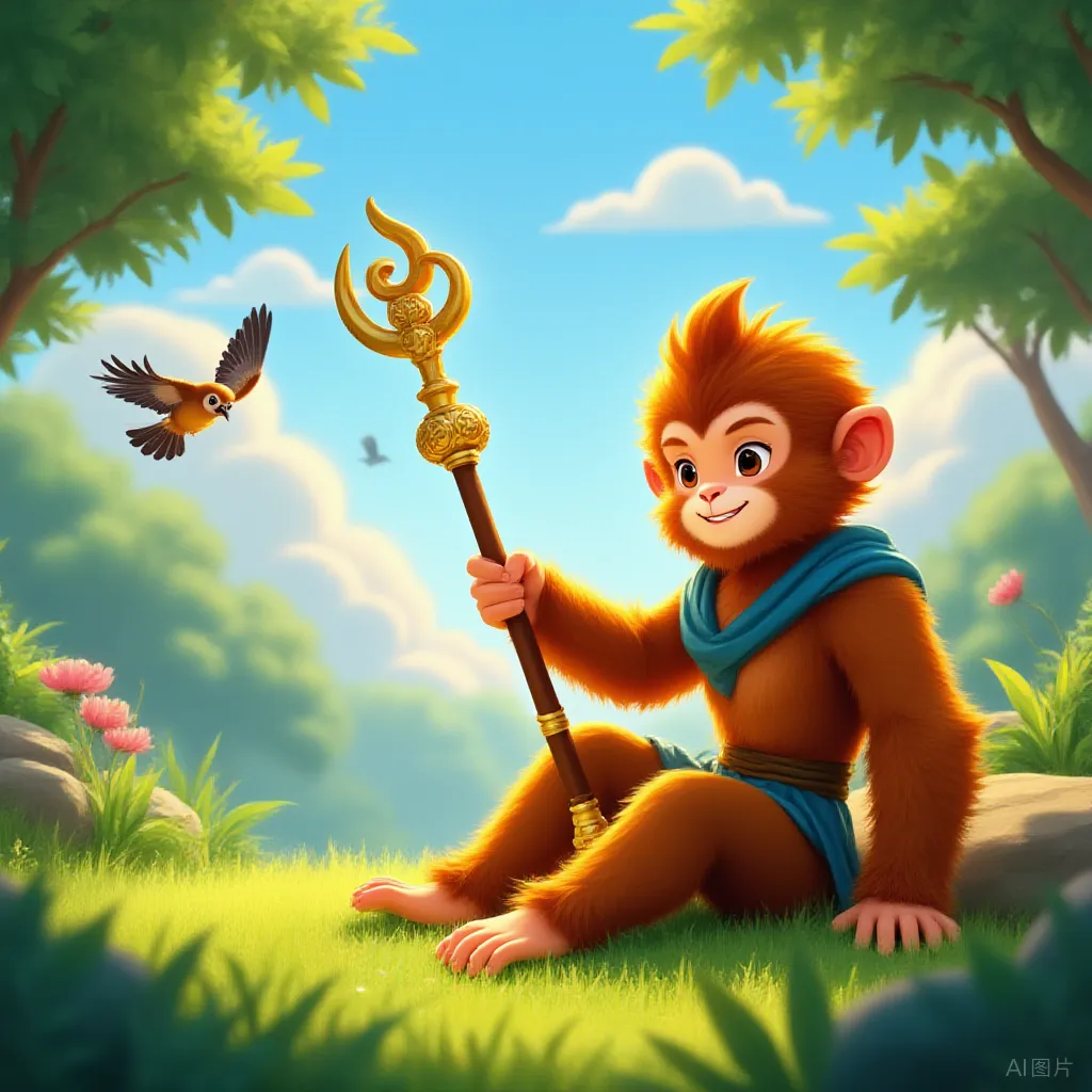 清晨,阳光像融化的蜂蜜一样洒在床上,我正趴在被窝里看《西游记》。忽然"咻"的一道金光闪过,书页里的孙悟空居然跳了出来!他头戴金灿灿的凤翅紫金冠,脚踩藕荷色云纹靴,手里的金箍棒"唰"地变得像牙签那么小。没等我喊出声,他就一把拉住我的手:"小娃娃,俺老孙带你耍子去!"