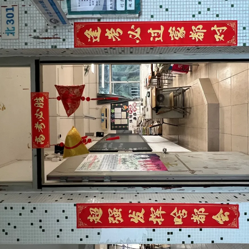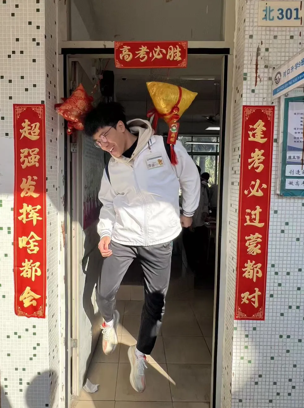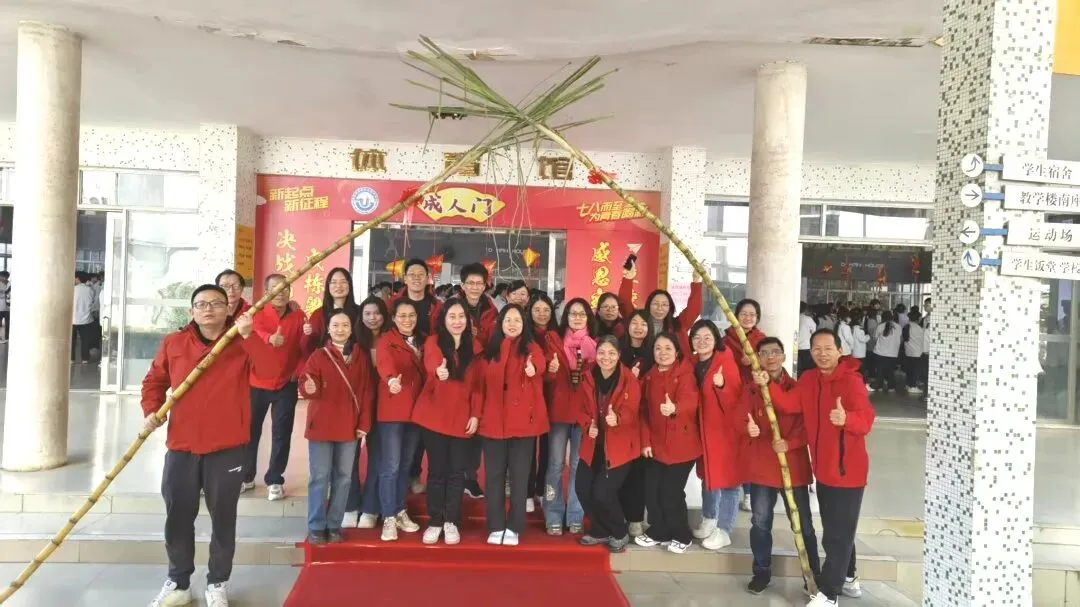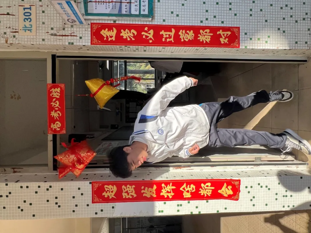 专业部更是以满满仪式感为学子们筑牢“护航防线”:鲜红的地毯礼堂延伸至教学楼中厅,宛如铺就通往梦想的星光大道;提前备好的粽子与甘蔗整齐陈列,寓意“节节高升、一举高中”,藏着最质朴也最真挚的祝福。专业部全体老师身着喜庆红装,早早守候在中厅走道,见到学子便送上热情的欢呼与有力的击掌,用温暖的笑容、真挚的鼓励传递着“我们与你同在”的力量。
