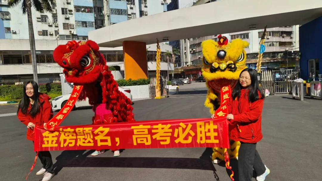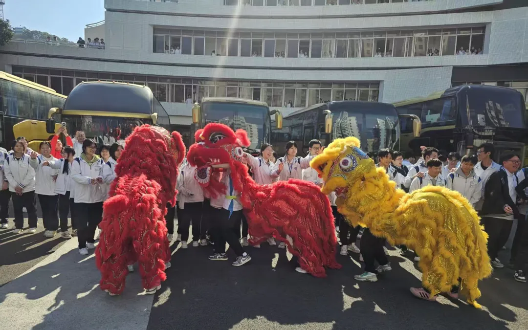 仪式现场最燃的莫过于威风凛凛的醒狮表演。专业部特意邀请的醒狮团队灵动跳跃、腾转挪移,红色和金色的狮身点缀着喜庆的纹饰,每一个动作都充满活力与气势,为出征学子助威壮行。学子们纷纷上前轻抚狮头,祈愿好运相伴,此刻,所有的紧张焦虑都化为勇往直前的动力。在阵阵欢呼与掌声中,2026届高考生们满怀信心,分批次有序登上“逐梦远航,金榜题名”的大巴车,向着考场、向着梦想的方向全速进发。