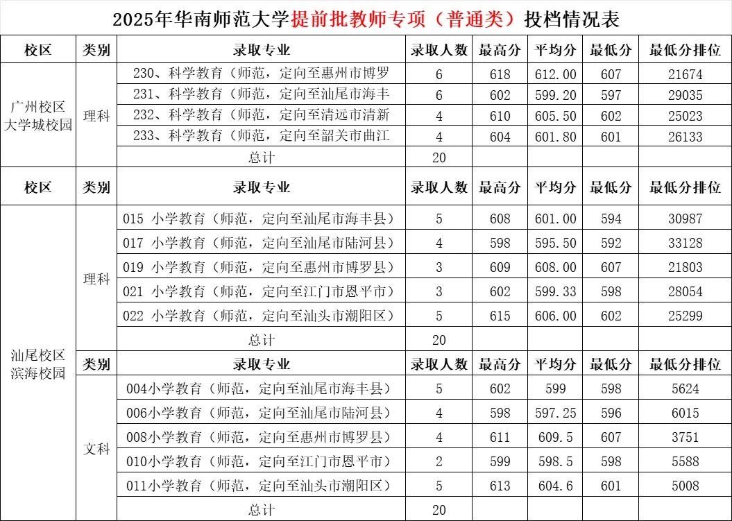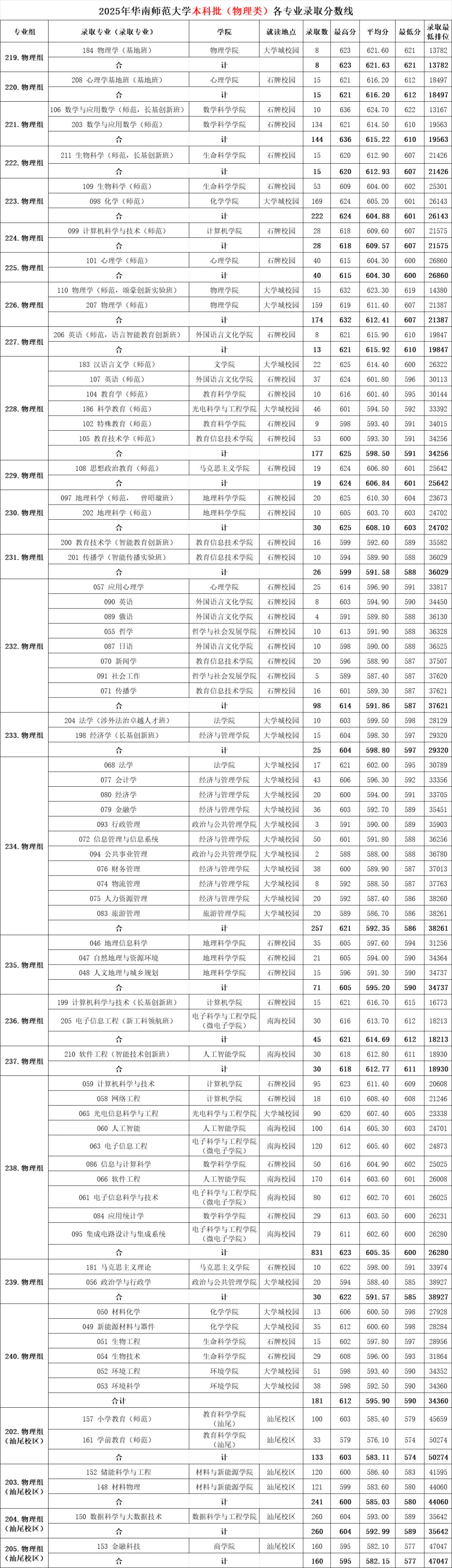 华南师范大学各专业录取分数线