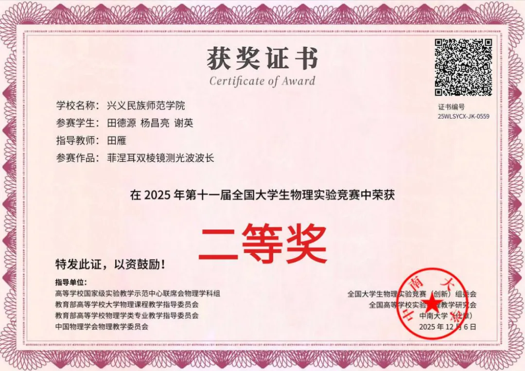 13.第十一届全国大学生物理实验竞赛(创新)荣获佳绩。12月5日,2025年第十一届全国大学生物理实验竞赛(创新)公布获奖名单,我校物理与工程技术学院学子在竞赛中荣获国家级二等奖。