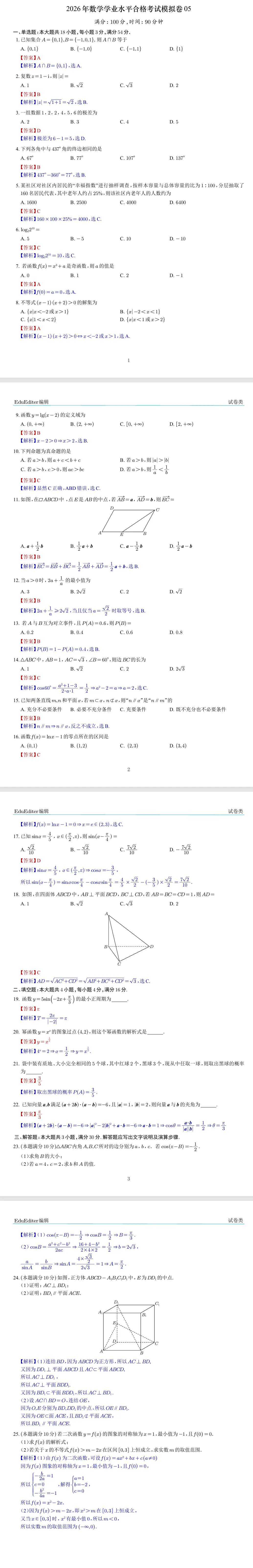 >2026年数学学业水平合格考试模拟卷05试题及答案