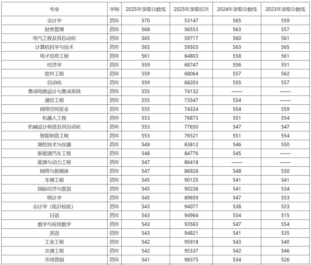 临沂校区普通类招生专业12个,录取分数最高的专业为会计学,录取最低分为543分,位次94981名;录取最低分专业为土木、水利与交通工程,录取最低分为481分,位次234230名。
