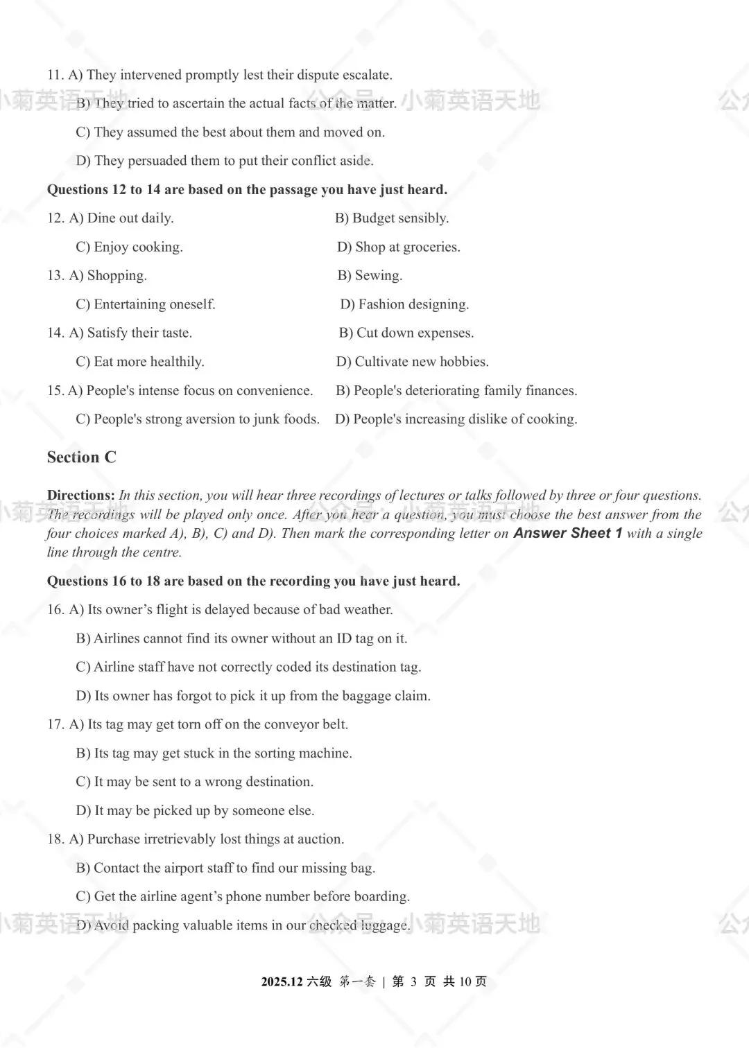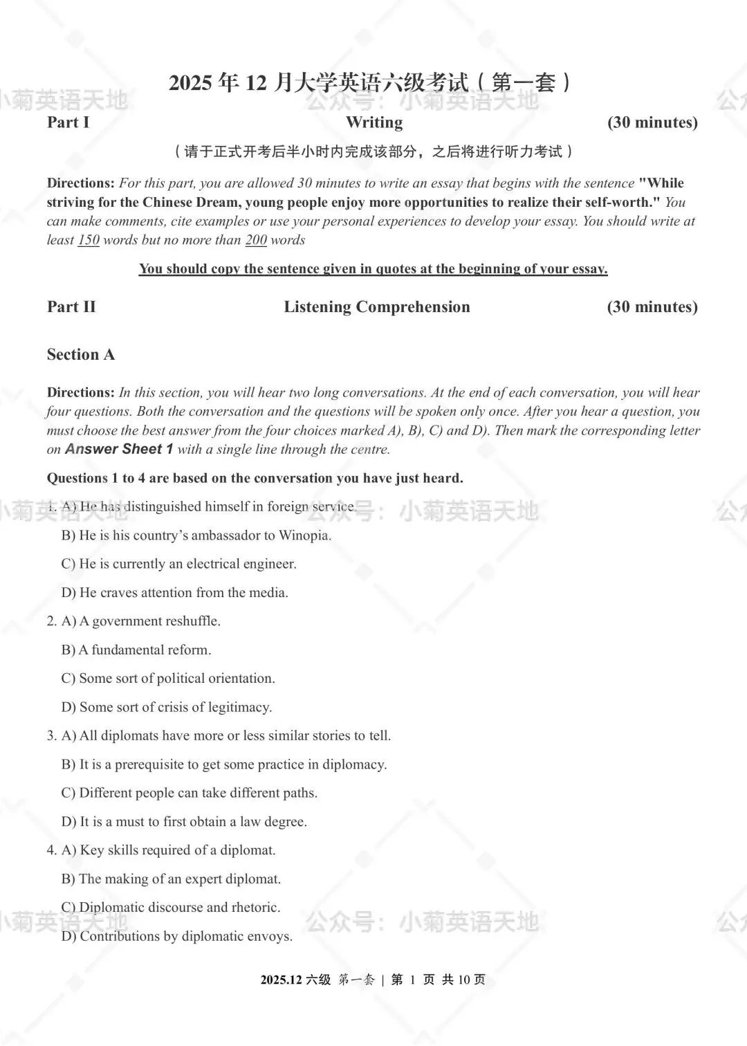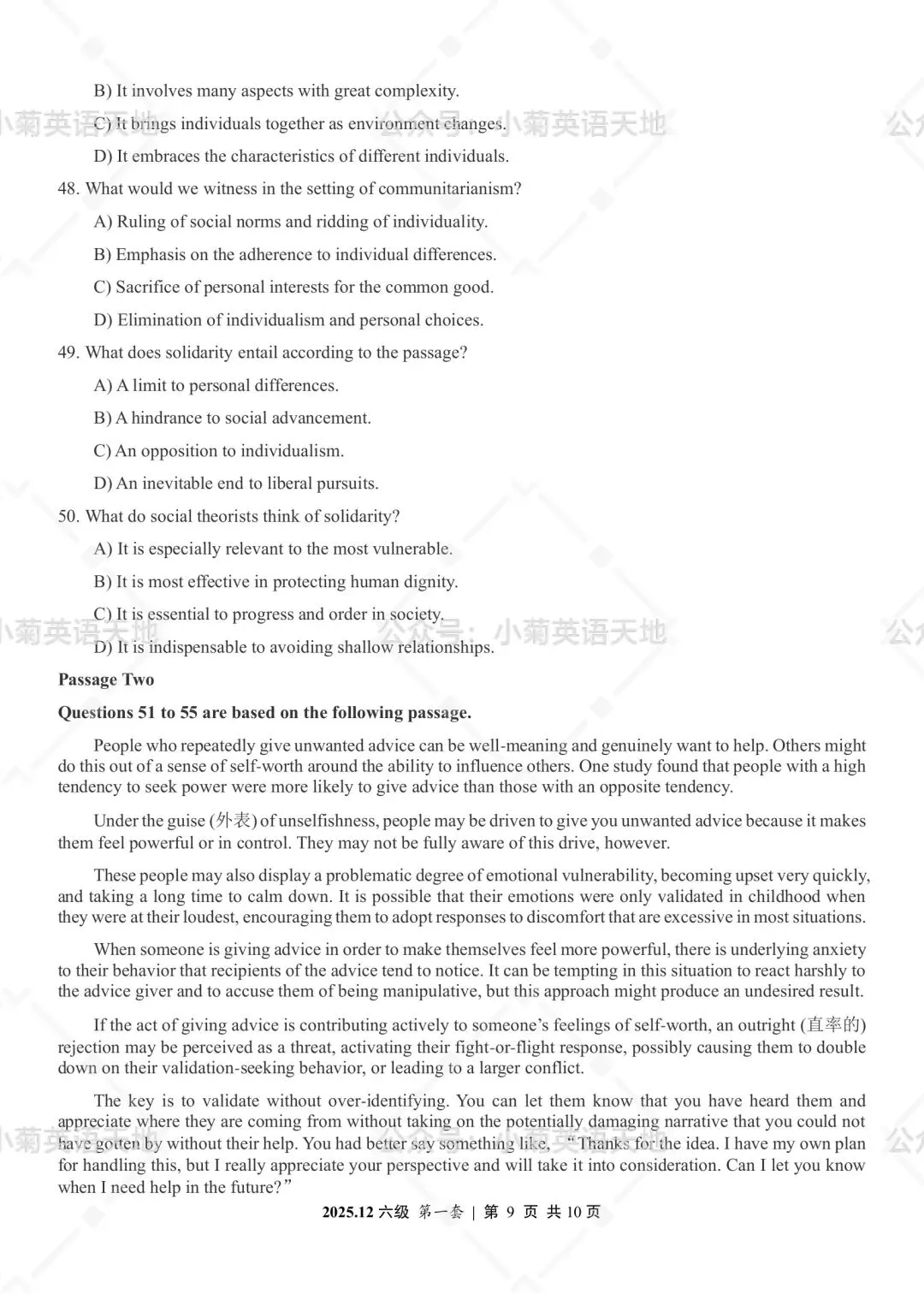 分享2025年12月全国大学英语六级考试真题(第一套)(PDF版原卷)