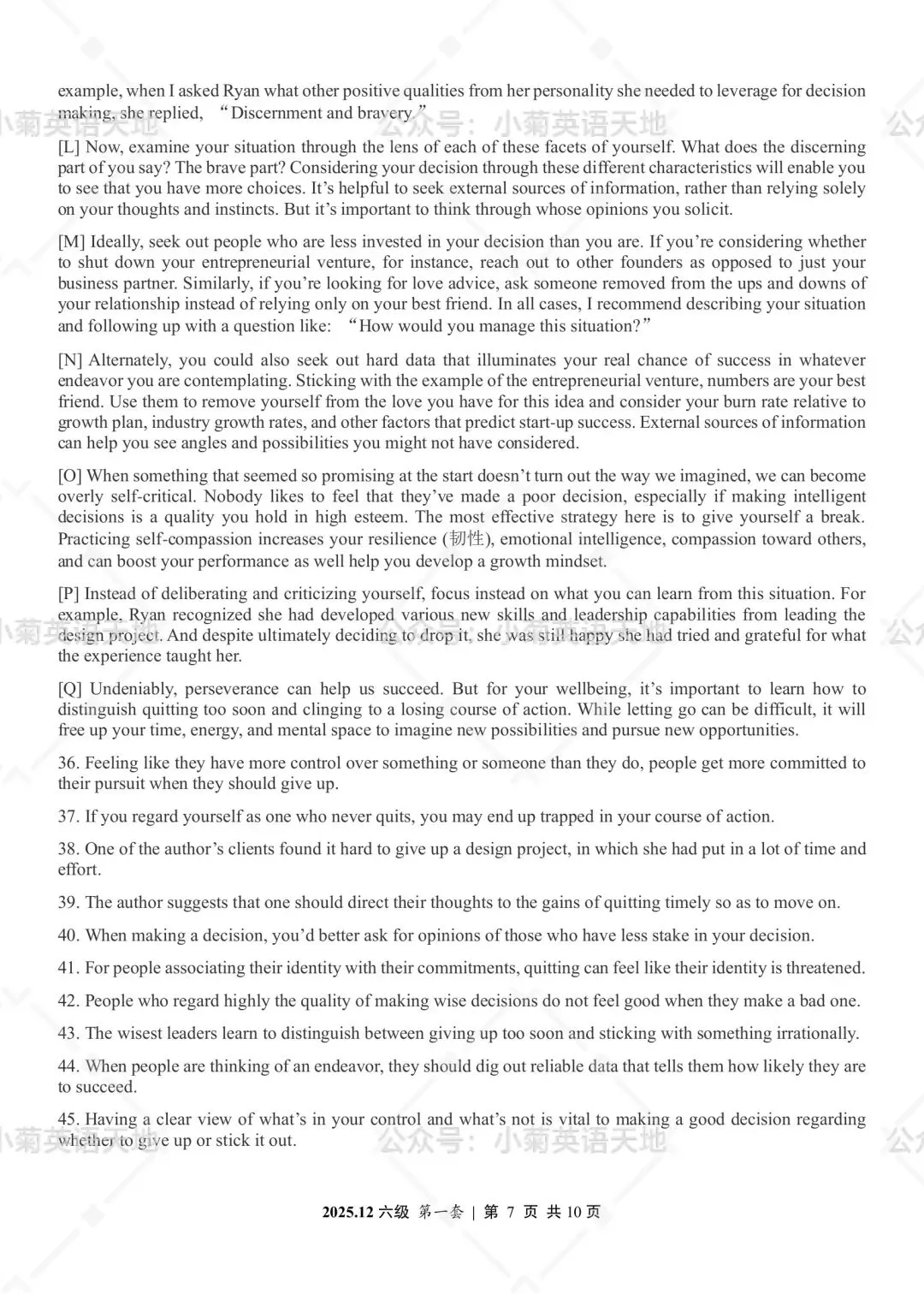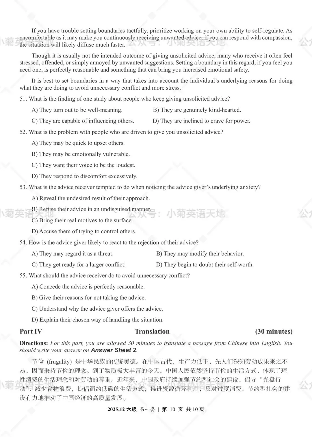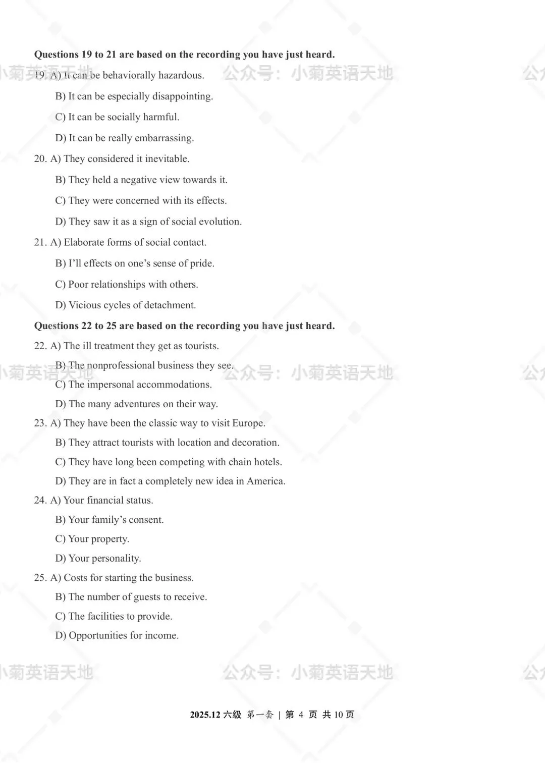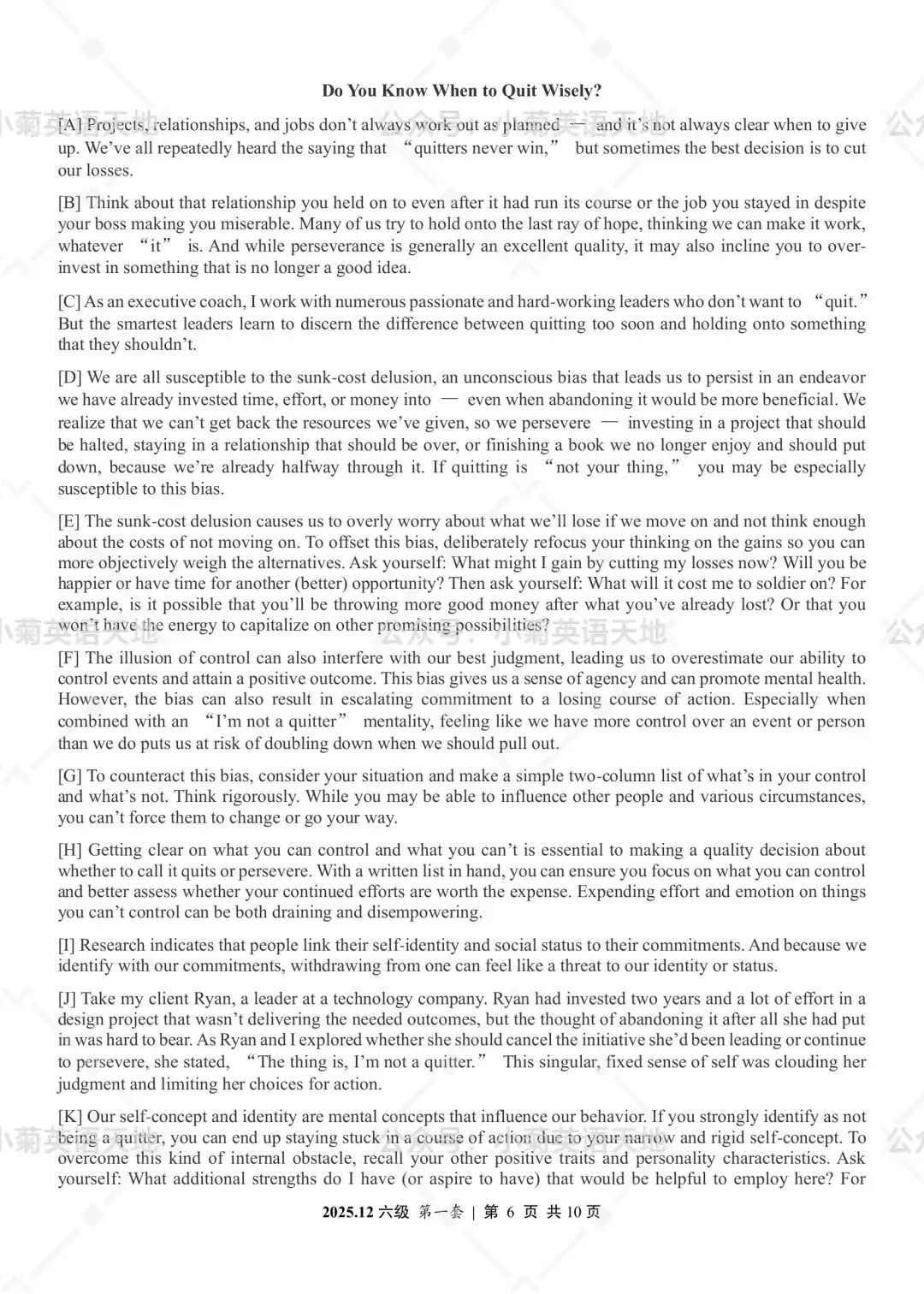 分享2025年12月全国大学英语六级考试真题(第一套)(PDF版原卷)
