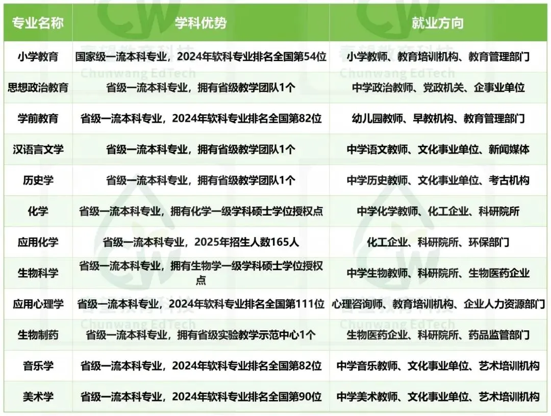 - B等级专业:应用心理学(全国第111名)、历史学(全国第118名)、思想政治教育(全国第126名)、机械电子工程(全国第131名)