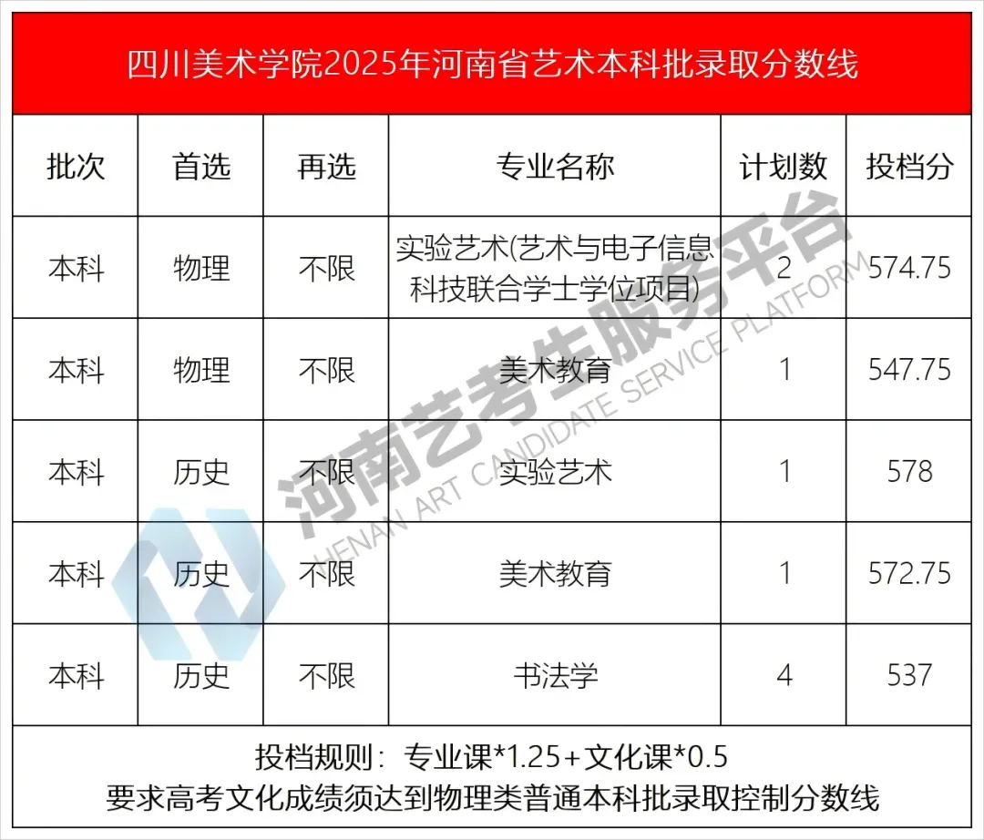 >四川美术学院2025年河南省艺术本科批录取分数线(统考)