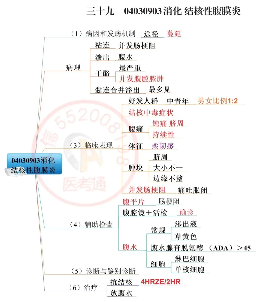 1.首选:腹水常规检查→腹水特点:渗出液,草黄色,比重>1.018,蛋白>30g/L; 白细胞>500×10°/L,ADA(腺苷脱氨酶)>45U/L;腹水中以淋巴细胞、单核细胞增高为主。【巧记:林丹结婚】