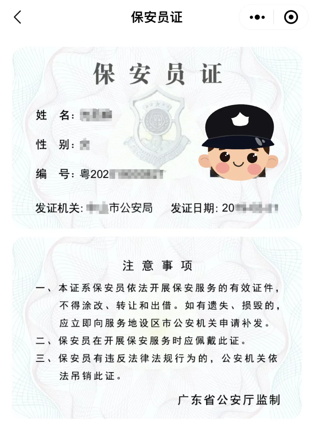 考试及格后,由省公安厅制证,培训有限公司联系并发放《保安员证》。附电子保安员证获取办法:
