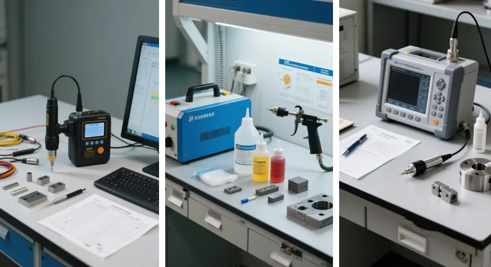 1. 磁粉探伤(MT,Magnetic Particle Testing)原理:利用缺陷处漏磁场与磁粉作用的原理,检测铁磁性材料表面及近表面缺陷。应用范围:适用于铁磁性材料、原材料、半成品、成品工件和在役的零部件检测,还可对板材、型材、管材、棒材、焊接件、铸钢件及锻钢件进行检测。