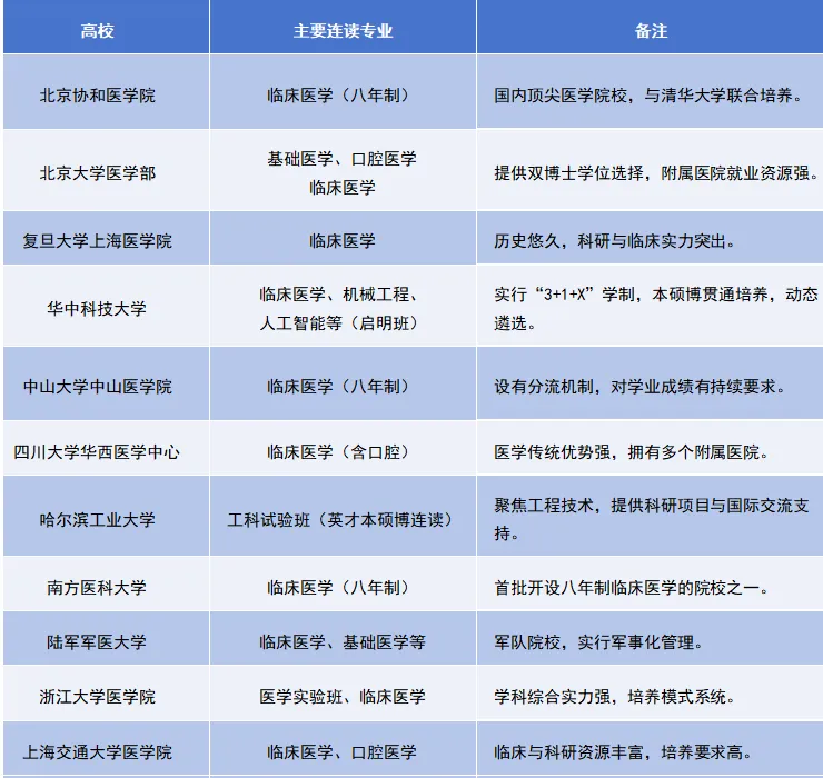 • 特点:学生通过选拔进入,实行导师制,可提前进入科研阶段。非全国统一的八年制临床医学模式,但属于贯通培养类型。