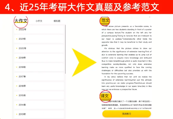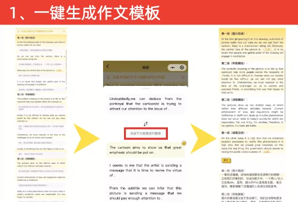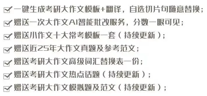 7年积淀,北外等名校硕博生打造的“最适合考研”的海量素材库已经建立(每年持续更新)!按照地区生成作文模板,每一句话还配有专业的中文译文,扫清一切背诵障碍!帮助你用短的时间,提高英语作文分数。