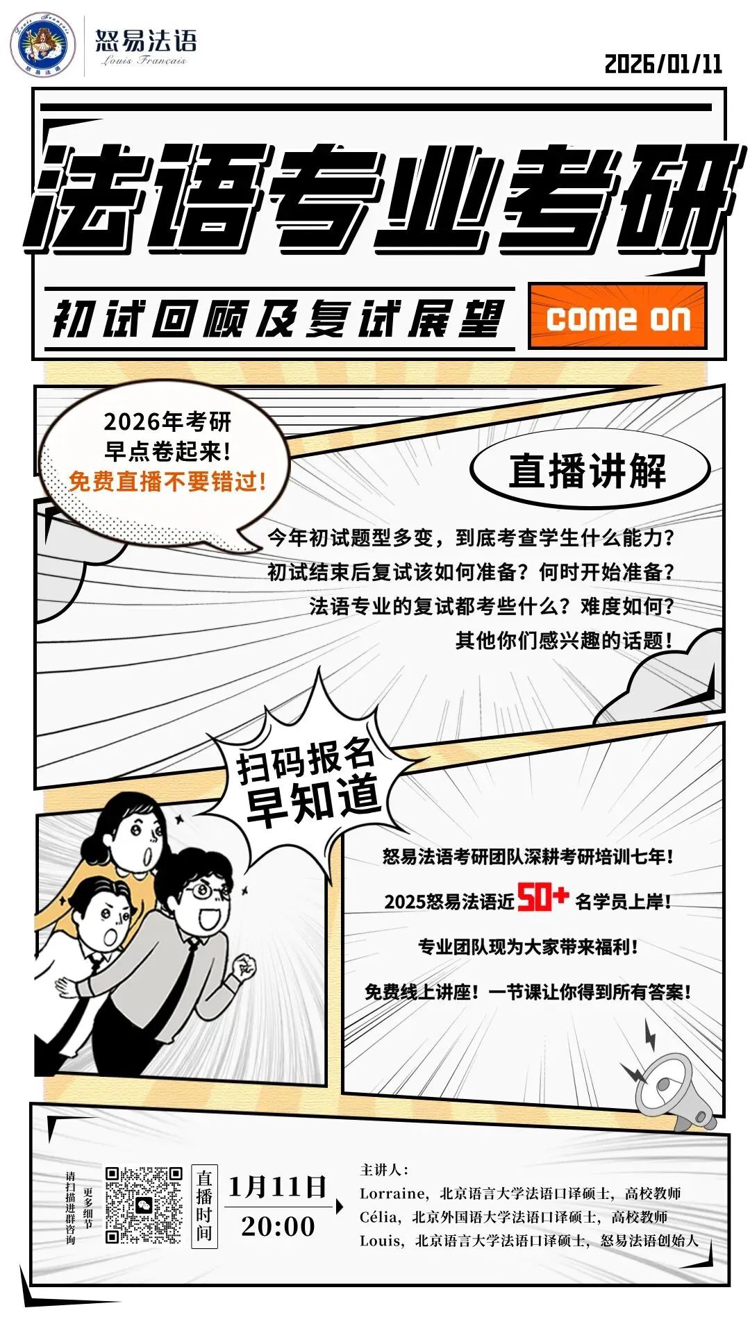 怒易法语将进行公益直播,带大家一起回顾2026年法语专业考研初试并展望复试,我们将讨论以下话题:
