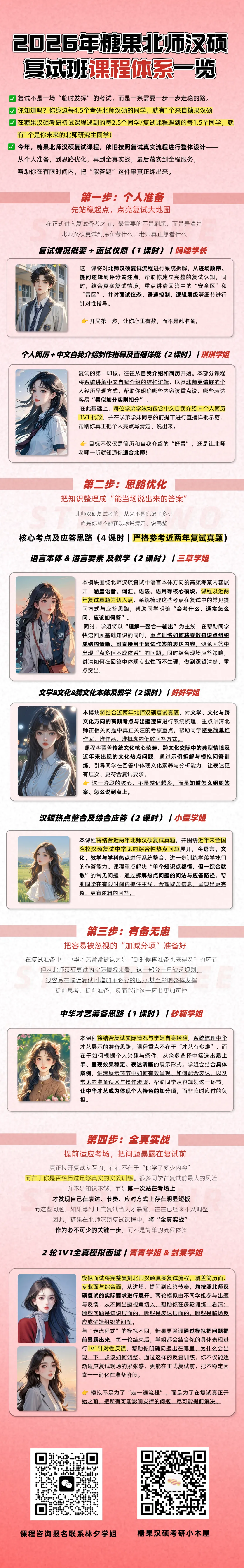 相较于其他考研机构复试课程仍以知识覆盖为主,糖果北师汉硕复试课程在内容设置上更加聚焦复试的实际考查方式。核心考点课程严格参考近两年北师汉硕复试真题,将语言本体、文学文化、三教、习得等内容,与具体提问方式和应答思路相结合,帮助同学真正学会“如何把所学内容说出来”。同时,通过汉硕热点整合课程与文献带读,引导同学在夯实基础的同时,提升综合理解与整合表达能力。整体课程更加注重“怎么答”“怎么说”,而不是停留在“知道什么”,更贴合北师汉硕复试对综合能力的要求。