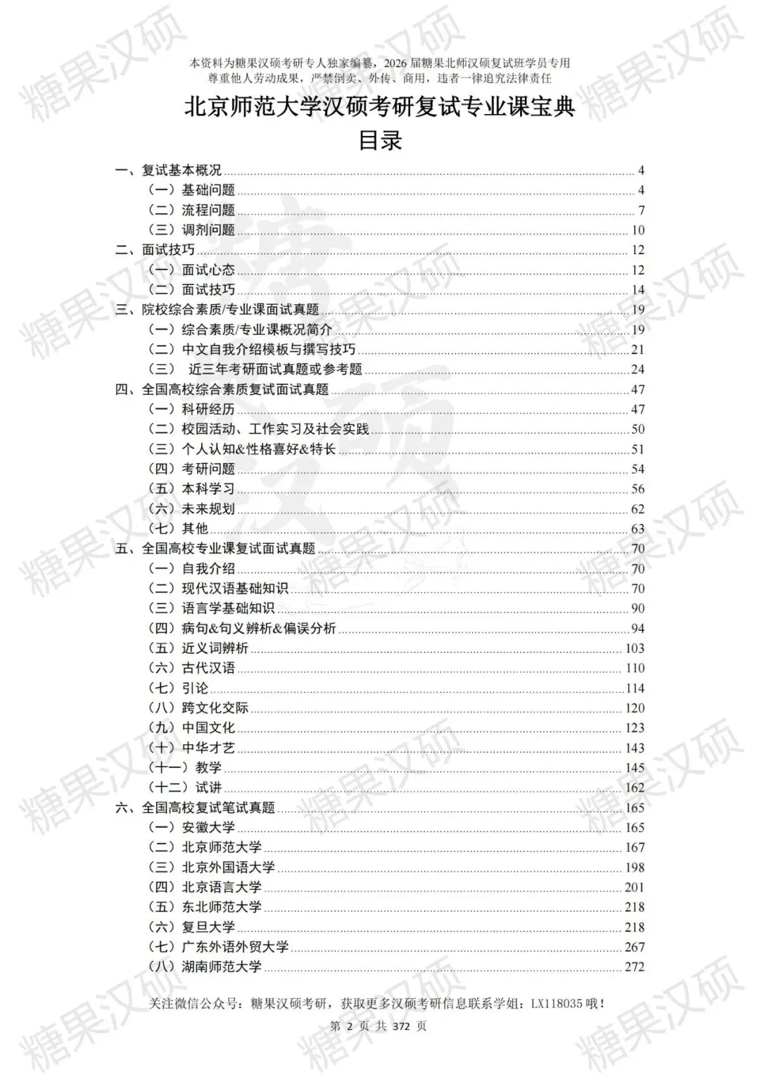 这本宝典里,首先会帮你把北师汉硕的复试考情和备考思路讲清楚,让你在复试准备一开始就知道:复试大概考什么、老师更关注哪些方向、准备时应该把力气花在哪里。接下来,我们系统整理了北师汉硕历年的院校复试题,把综合素质、专业课、语言本体、文学文化、教学与实践、科研与热点这些高频内容全部覆盖到位,方便你对着目标院校,有方向地去准备。