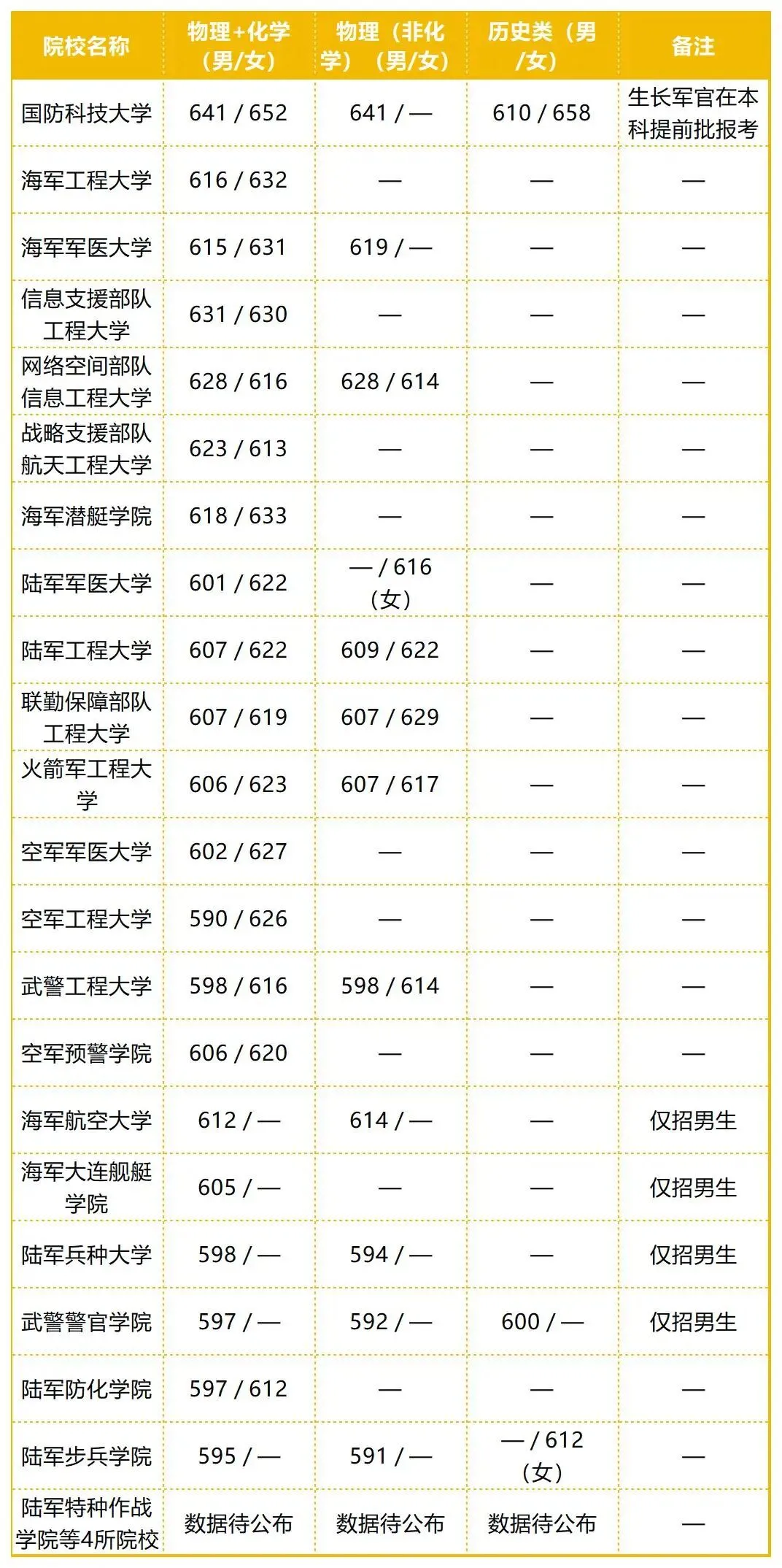 顶尖军校竞争激烈,部分专业超650分;警校层次分明,适配不同分数段。下方为官方数据整理,建议家长收藏!