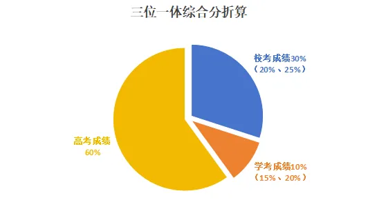 “一体”:将上述三个成绩按一定比例合成综合成绩,最终按综合成绩的高低来择优录取考生,打破了“一考定终生”的局面。